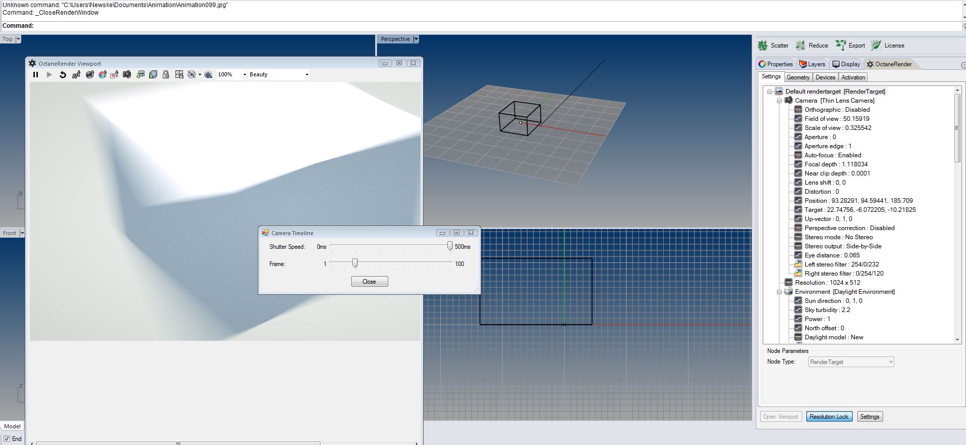 - Press the animation button in OctaneRender. The animation the runs through and prints a whole string of commands to Rhino's console (is this intentional? _ViewFrameNumber?).