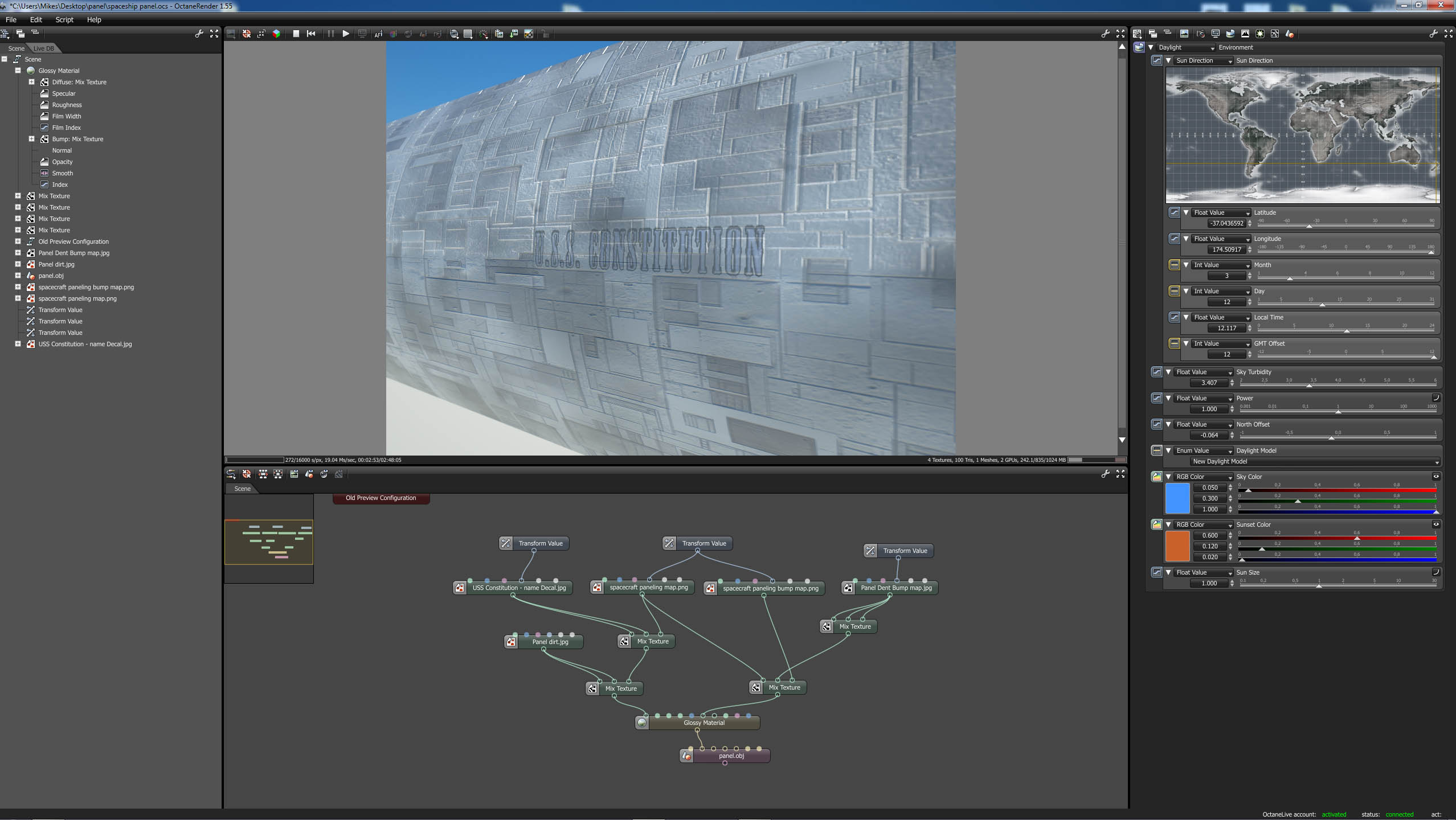 I then Imported the mesh into Octane and started layering up and positioning the various diffused and Bump Maps on the surface.