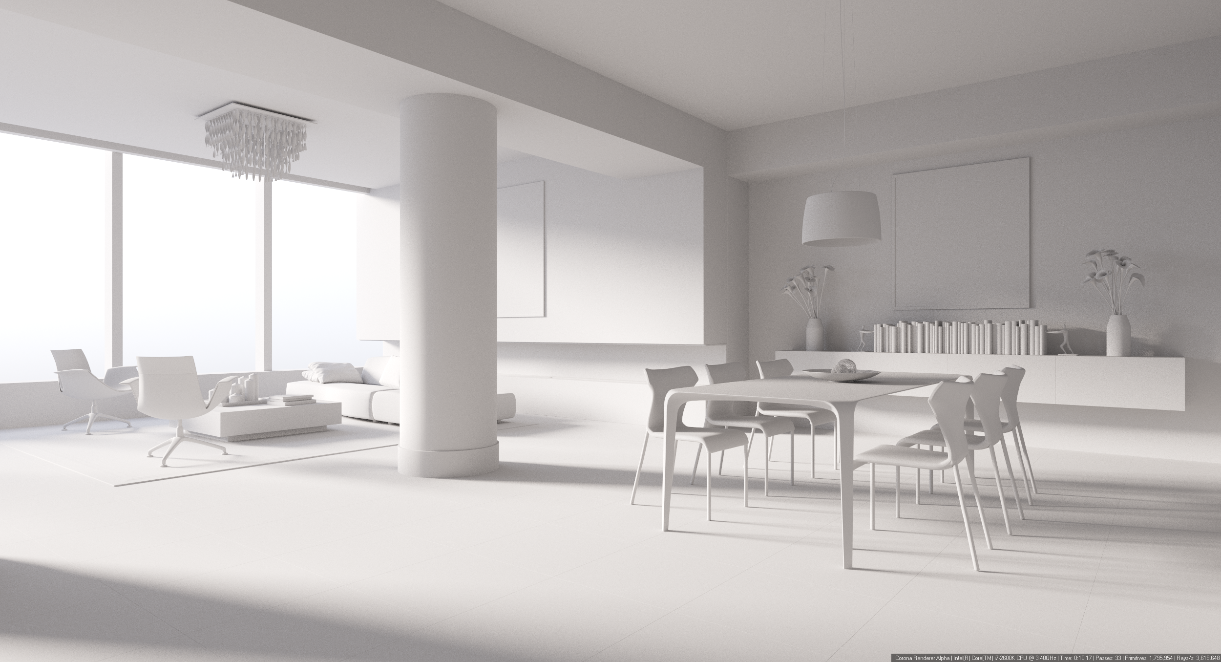About those "unnatural bright interiors" think it's some sort of a trend that especially realEstate agencies are pushing for.. - in reality architectural photographers use some fill lights (spot & soft-boxes) take multiple exposures & blend things out in order to get appealing image that in reality is rarely seen =) Knowing this we can use that in our advantage too - as evenly lit interior will get clean output faster in Octane =)