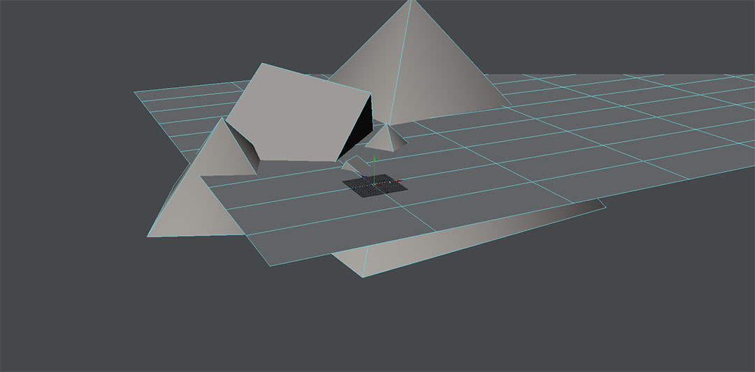 I've been rendering a little bit now and I see an error in one of the pyramids in the background. I'm not sure why it's happening. All the geometry in the background are different objects, and have the exact same surface settings, a diffuse material. So they shouldn't reflect anything or be glossy.