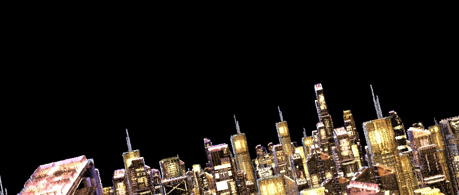 I'm going for this glowing-city look. The buildings are generated with simple geometry with a displacement material on them. The material is a specular material with absorption medium. Inside the buildings are the area lights. The buildings and the lights are in separate cloner objects, so I can use render instances on the geometry.