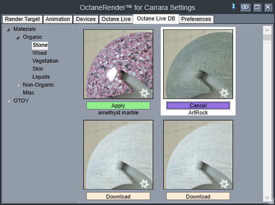 You can also Apply downloaded materials using the Octane Viewport. To do this, click on the Apply button after you have downloaded a material. Now, whatever you click on in the Octane viewport will get the new material. You can also right click to get a list of stacked materials. Select an item in the list to apply the material. To exit Apply mode either click on the Cancel button in the LiveDB tab, apply a different material or press the <ESC>ape key.