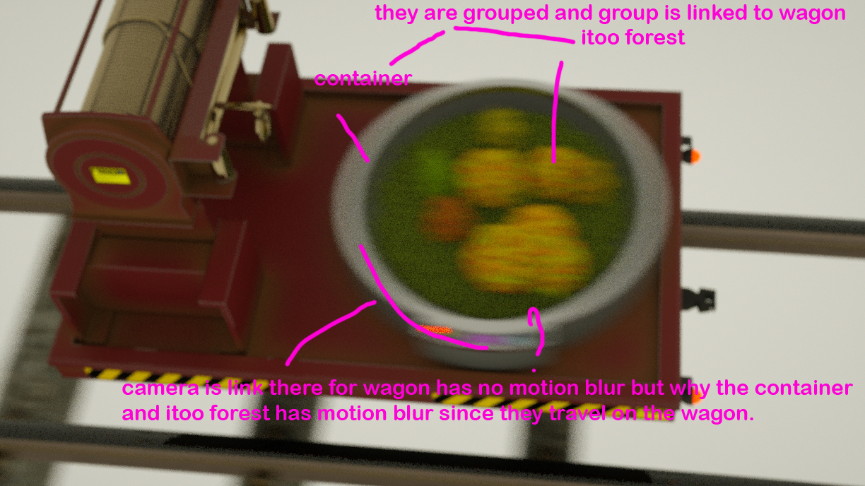 I have two objects itoo forest and a container (regular mesh) grouped and they are GROUPED and then LINKED to the wagon that is traveling. Also camera is linked to the wagon. So the only thing that should have motion blur are railroad wooden beams. But here you can see that wagon is ok no motion blur but container and itoo forest have but they are traveling at the same speed as the wagon and the camera so they should have no motion blur.