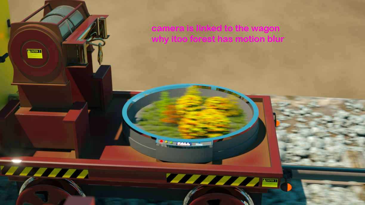 Second image shows linked ittoo forest and container to the wagon but camera is NOT linked. So basically wagon is passing by the camera that carries container with itoo forest plant and here container and itoo forest do NOT have motion blur. Seems like these two cases should be reversed.