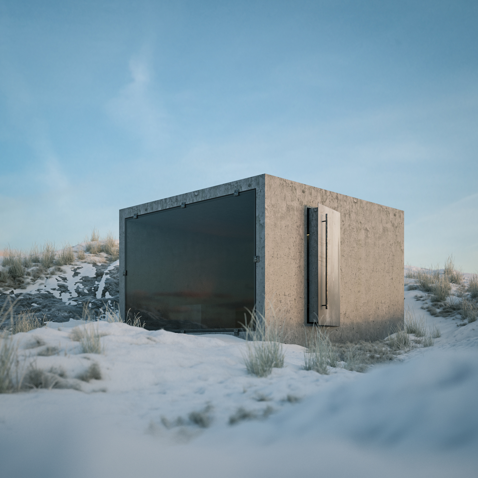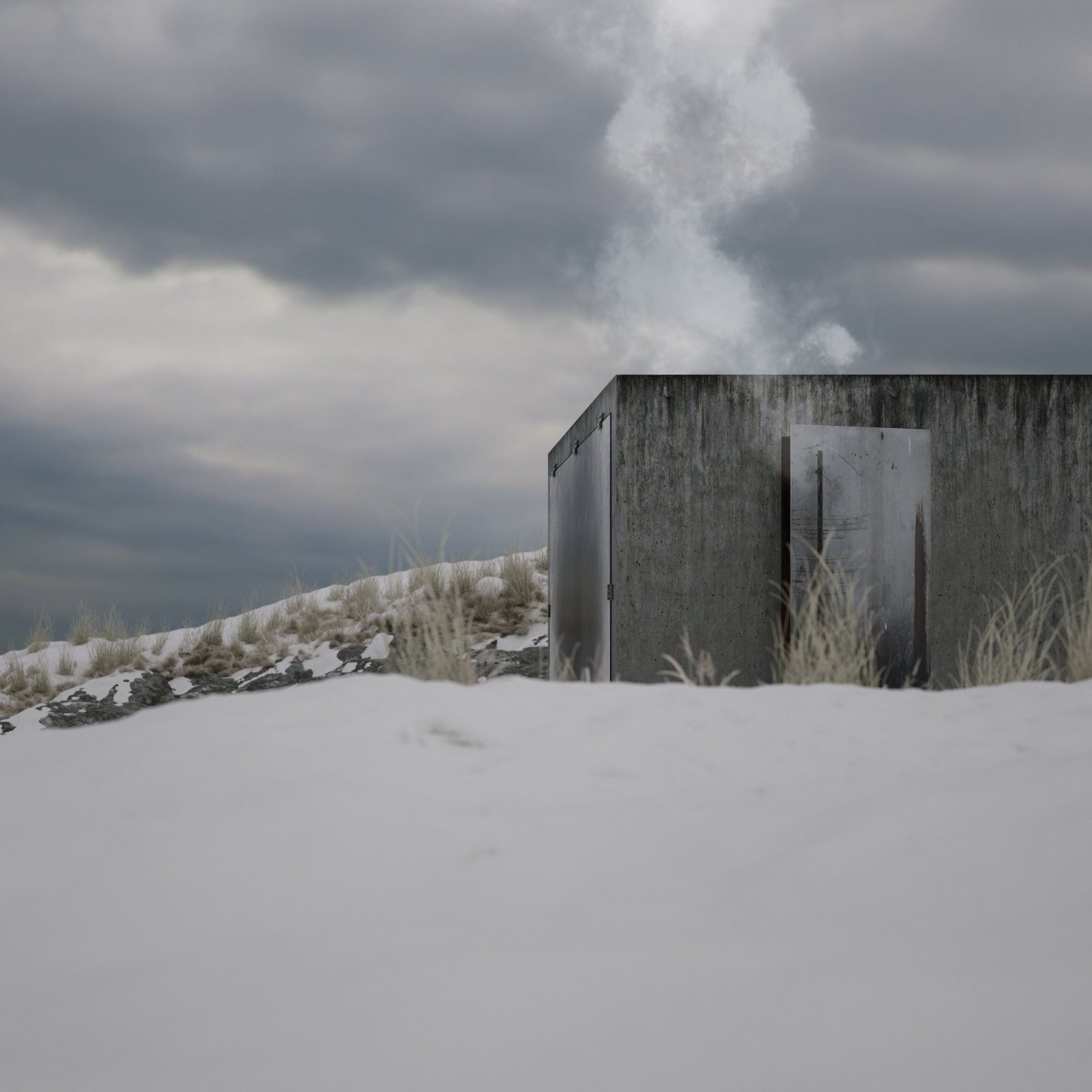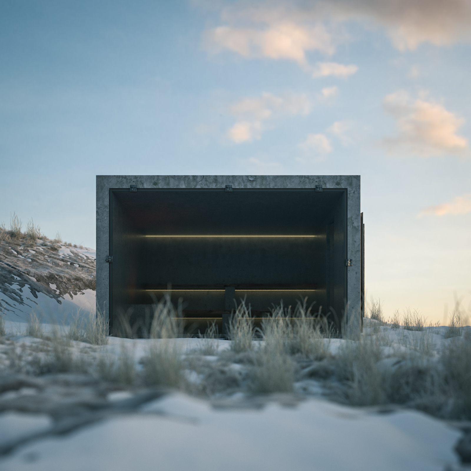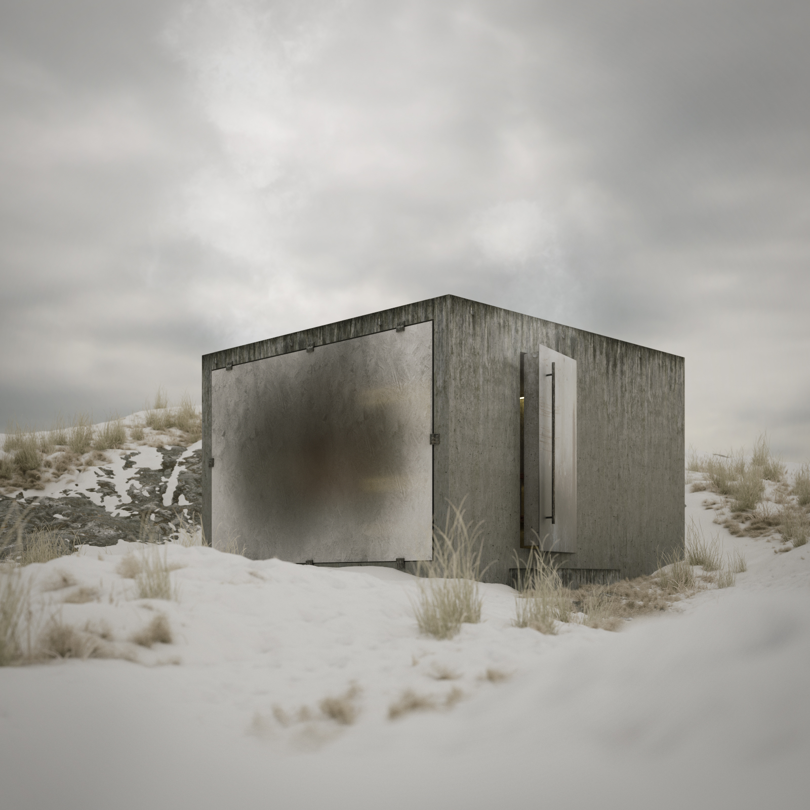 ]Here's a little Octane Render test project I've been working on for fun. A CCCP architecture style sauna. In a cold nordic environment. Sigurd Lewerentz inspired glass facade with his kind of bare window sockets.