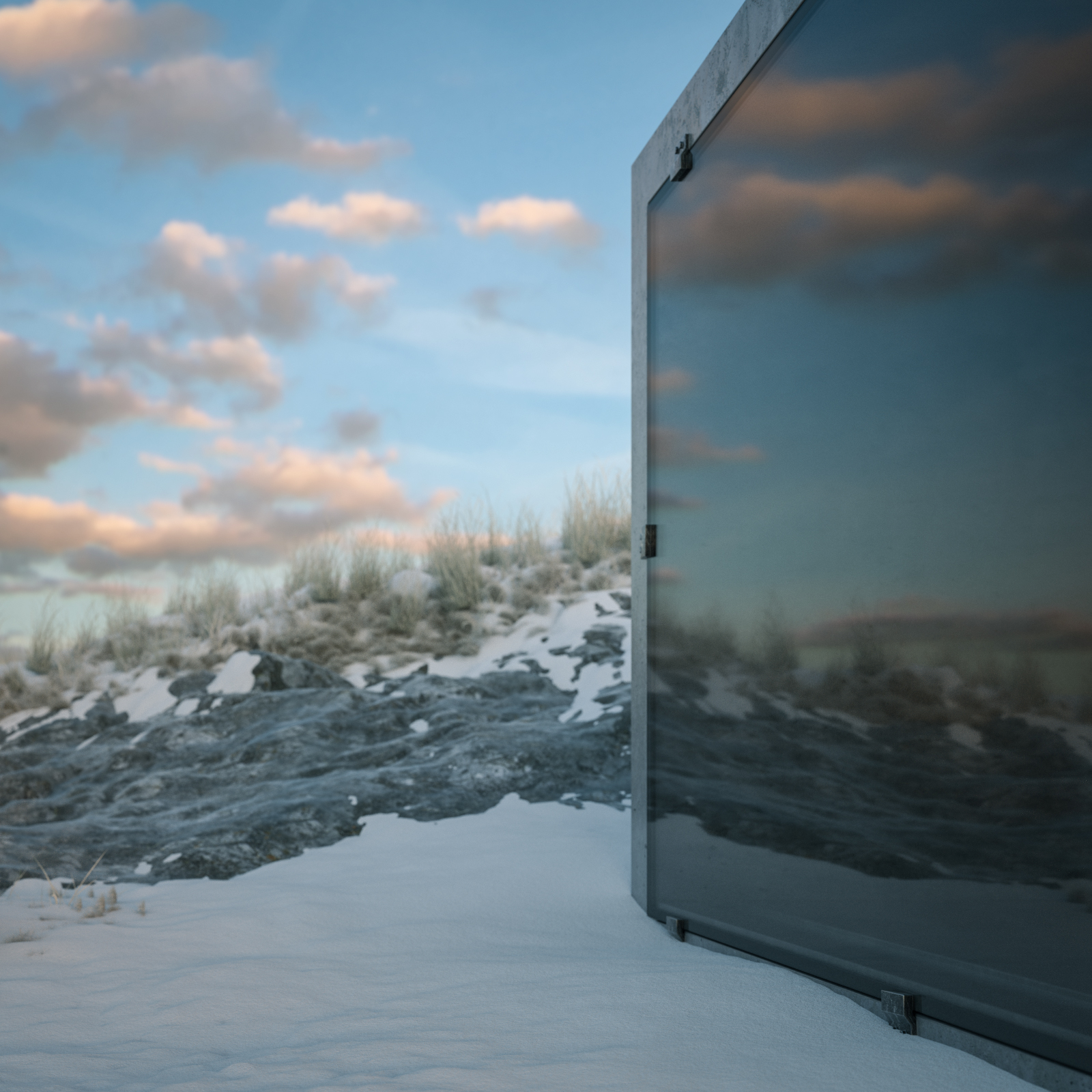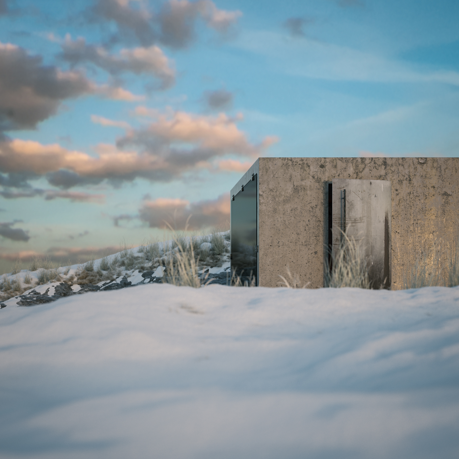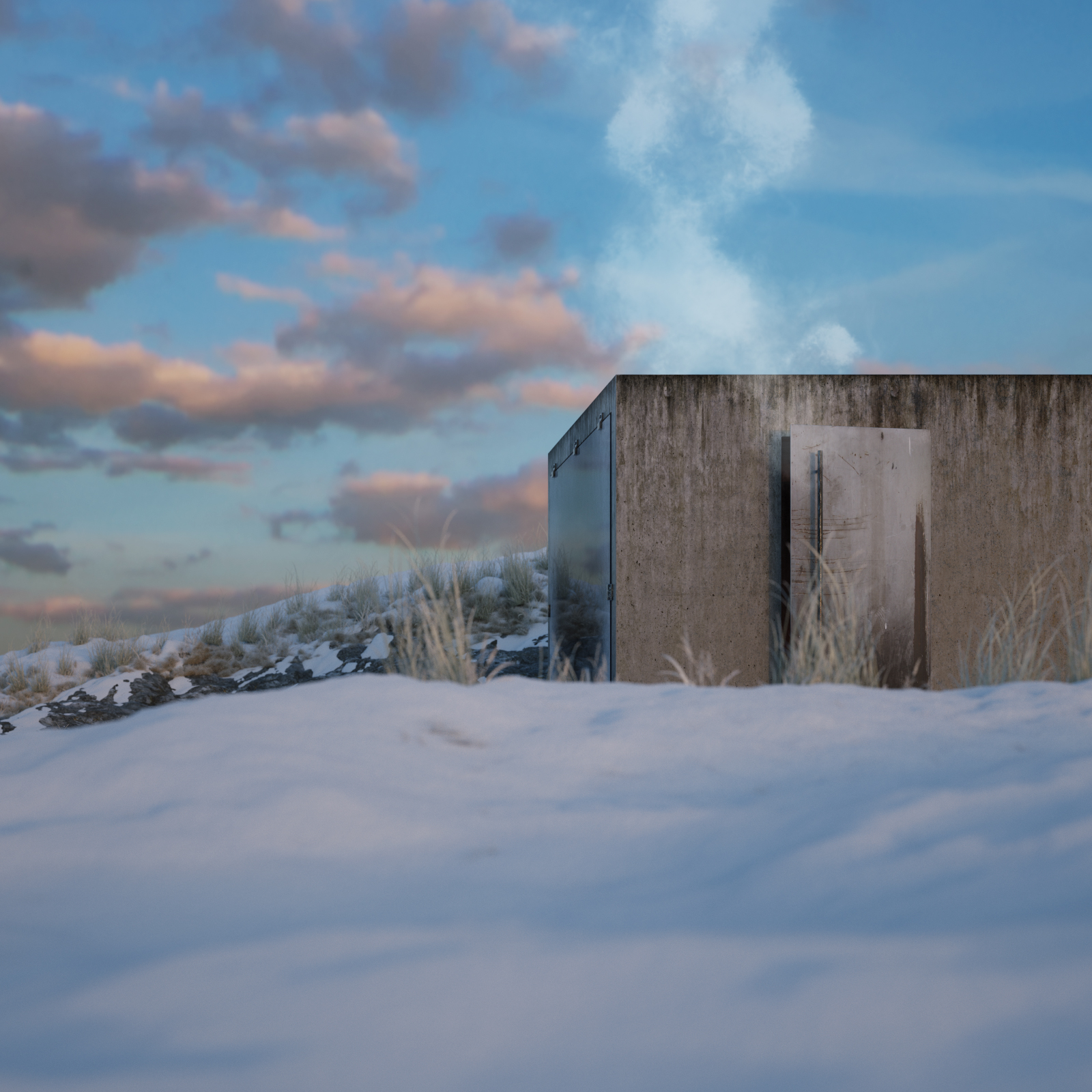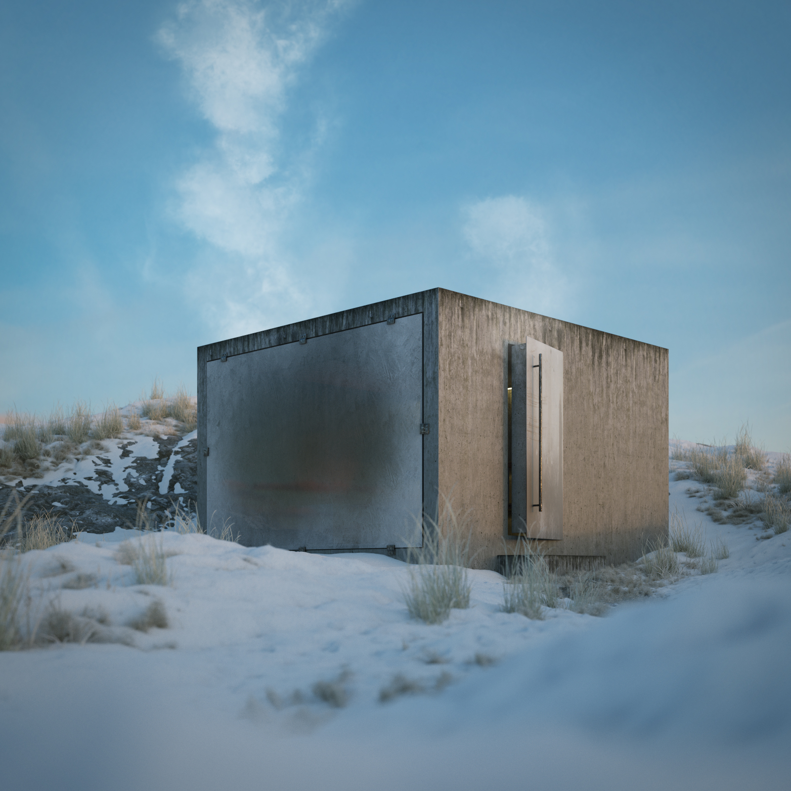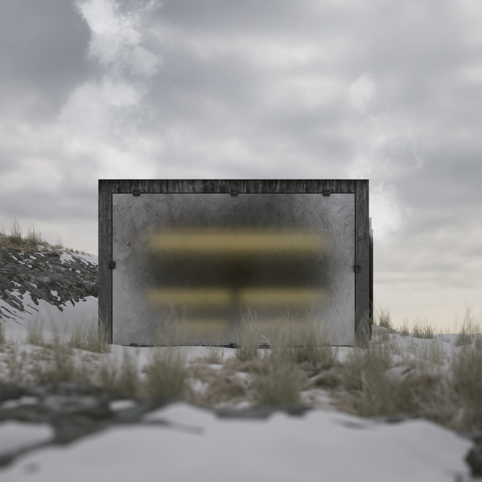 ]Here's a little Octane Render test project I've been working on for fun. A CCCP architecture style sauna. In a cold nordic environment. Sigurd Lewerentz inspired glass facade with his kind of bare window sockets.