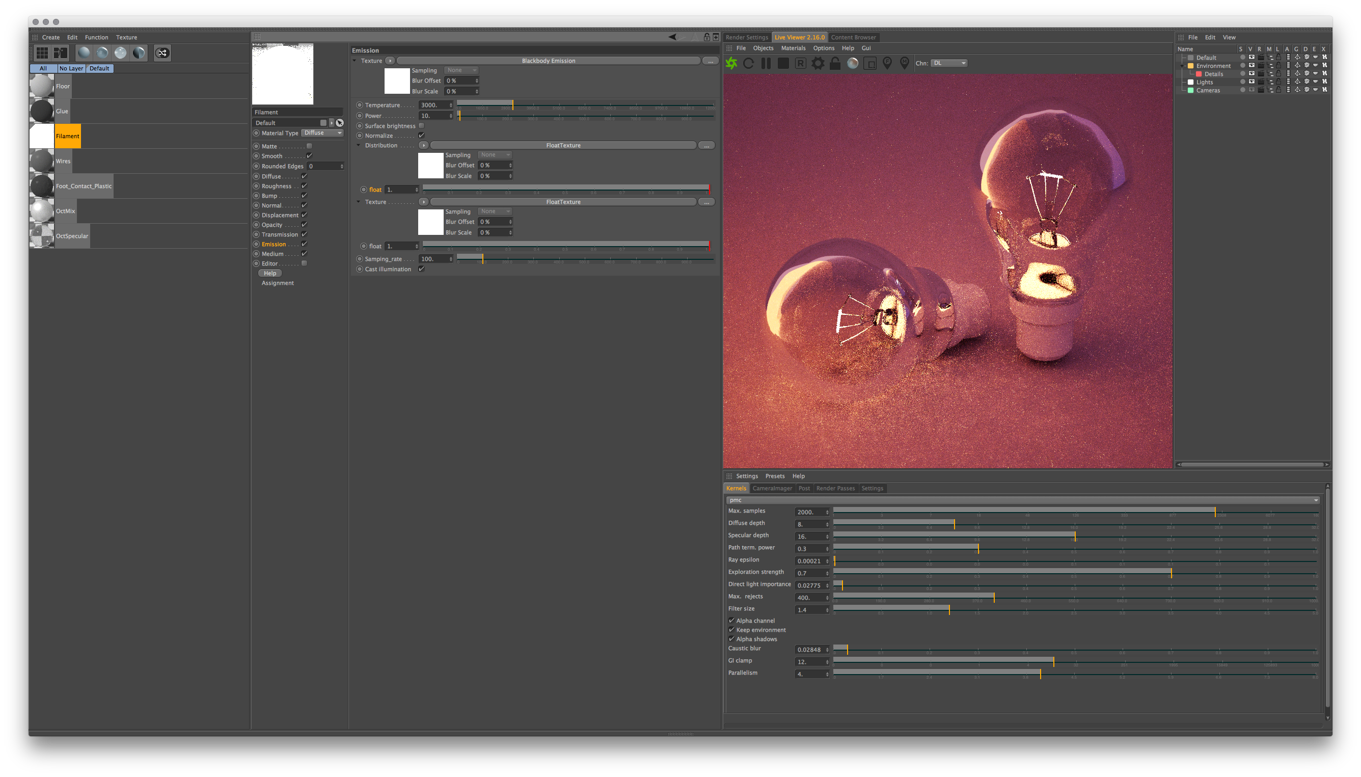 Does the blackbody emitter on the filament material need to be configured differently because it's a small light source? I'm struggling to understand the balance between the power and efficiency settings.