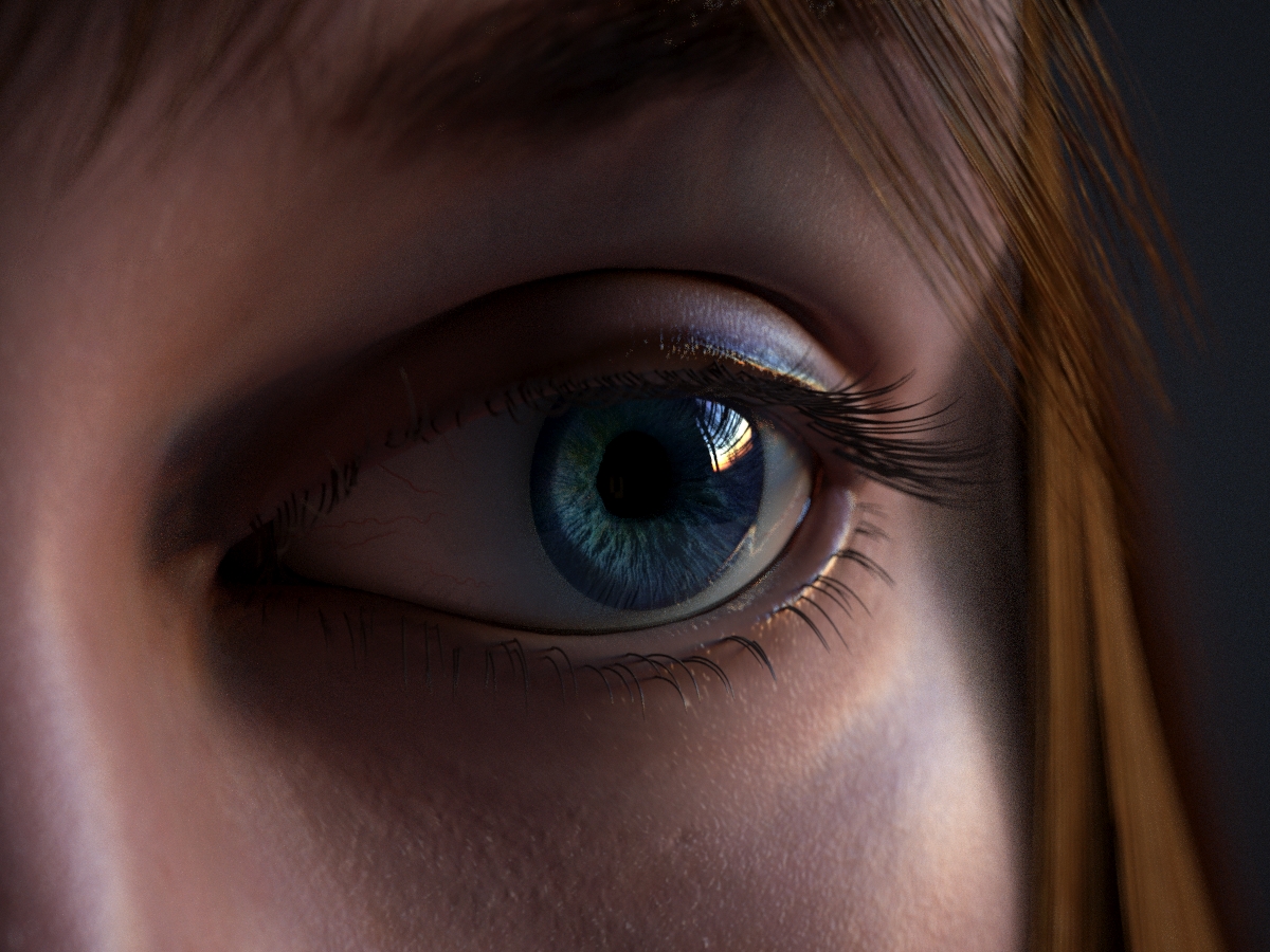 looking alot better with that new skin shader. I think a couple things you should focus on right now are the interaction between the eyeball liquid and eye lid. the liquid should kinda connect the two, and cover everything, whereas your eyeball is just kinda stuck inside of the eyelid. The edge of the iris shouldn't be as hard of a transition. Also, I would work on the eyelashes to get them up to the quality level of the eyeball. I think it'll be easier to judge what's going on with the eye if those aren't so fake looking in comparison. here's a high res eye sample so you can see the iris blending between the color and white. and also get a better idea of the liquid.