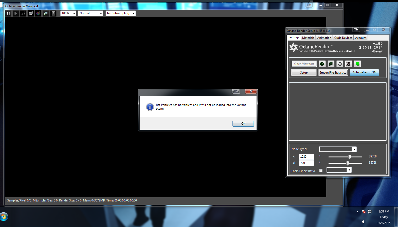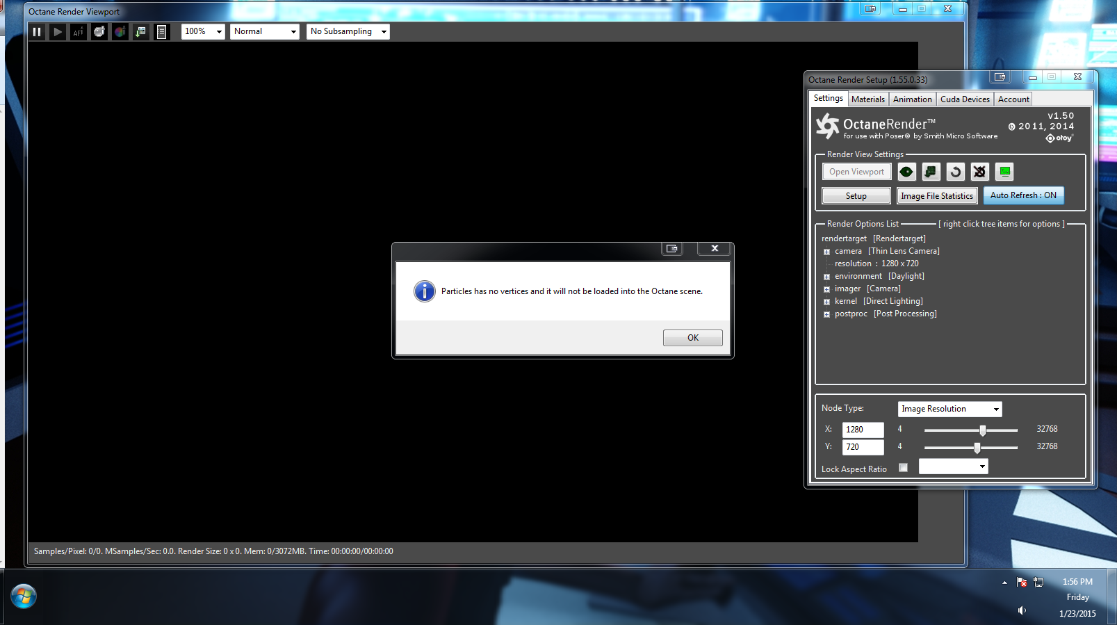 Now the biggest problem is when rendering an animation. Now i have to enable refresh scene each frame so it well render the animation but I get those three errors at the start of each frame render. Now Its will render it out, I just have to hit okay button three times before octane render the next frame. Is there a way around this. these two tool for poser will work great together if you ask me.