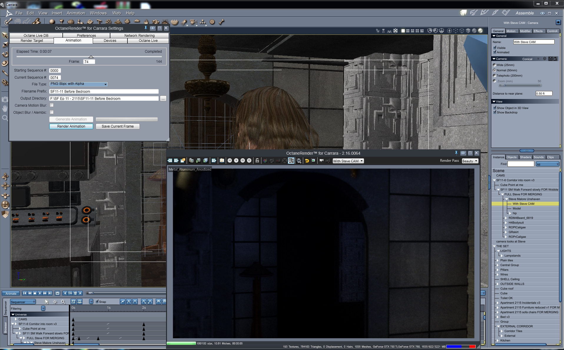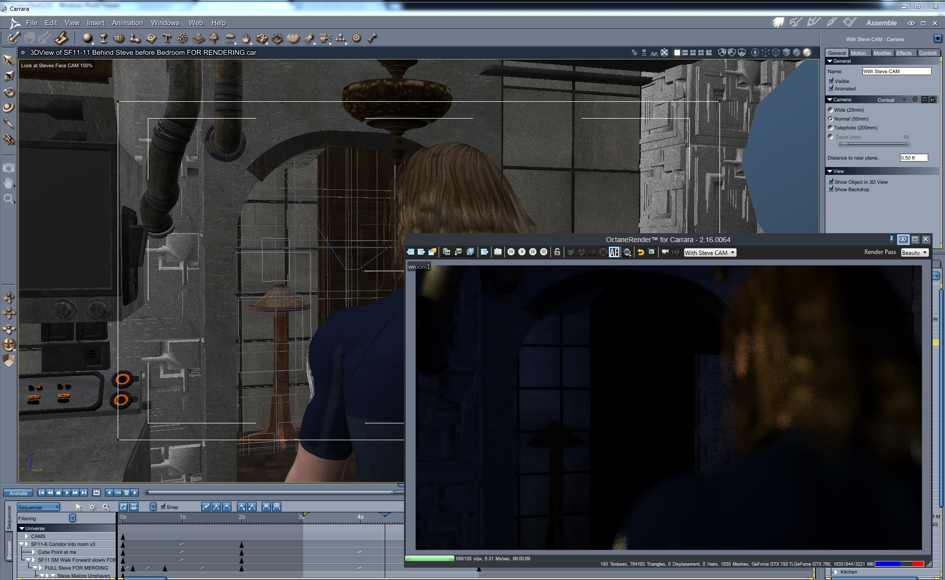 2. The camera (which is nested) does not move with the figure. Sometimes it's behind the action, sometimes in front. It's not that predicable. Either way in the carrara viewport I keep the camera at the same distance from the figure. This isn't happening during render time. (shot 2)