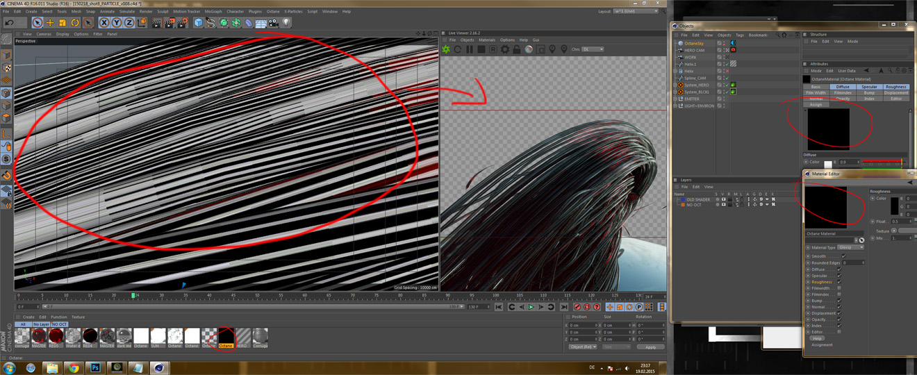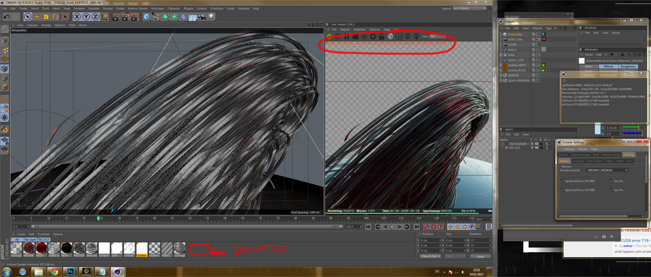 2. This image shows the live viewer with performance issues though the 22k texture is deleted. There are no ohter big textures in that scene. Btw. what does it mean, when red text appears within the top of the live viewer while its calculating the image...I guess it communicates that it has performance problems?!