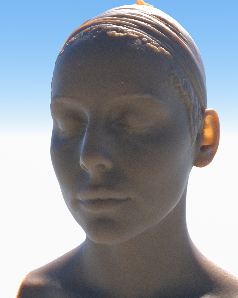 Here's an example I put together of tonysculptor Skin R20 being used on a head model. The two different pictures of the nodes are to illustrate where the texture map is added. It is just replacing the one RGB color that is feeding into the color corrections which are feeding into the transmission pins. I also upped the scale on both scattering nodes to 3000. And I adjusted the final mix material node to .25. And one last change I made was lowering the specularity from its rather high default to an RGB value of 154-154-154. I mentioned in an earlier post that you might need to adjust the gamma of your image, but I left it at 2.2 here and I think that's working fine.