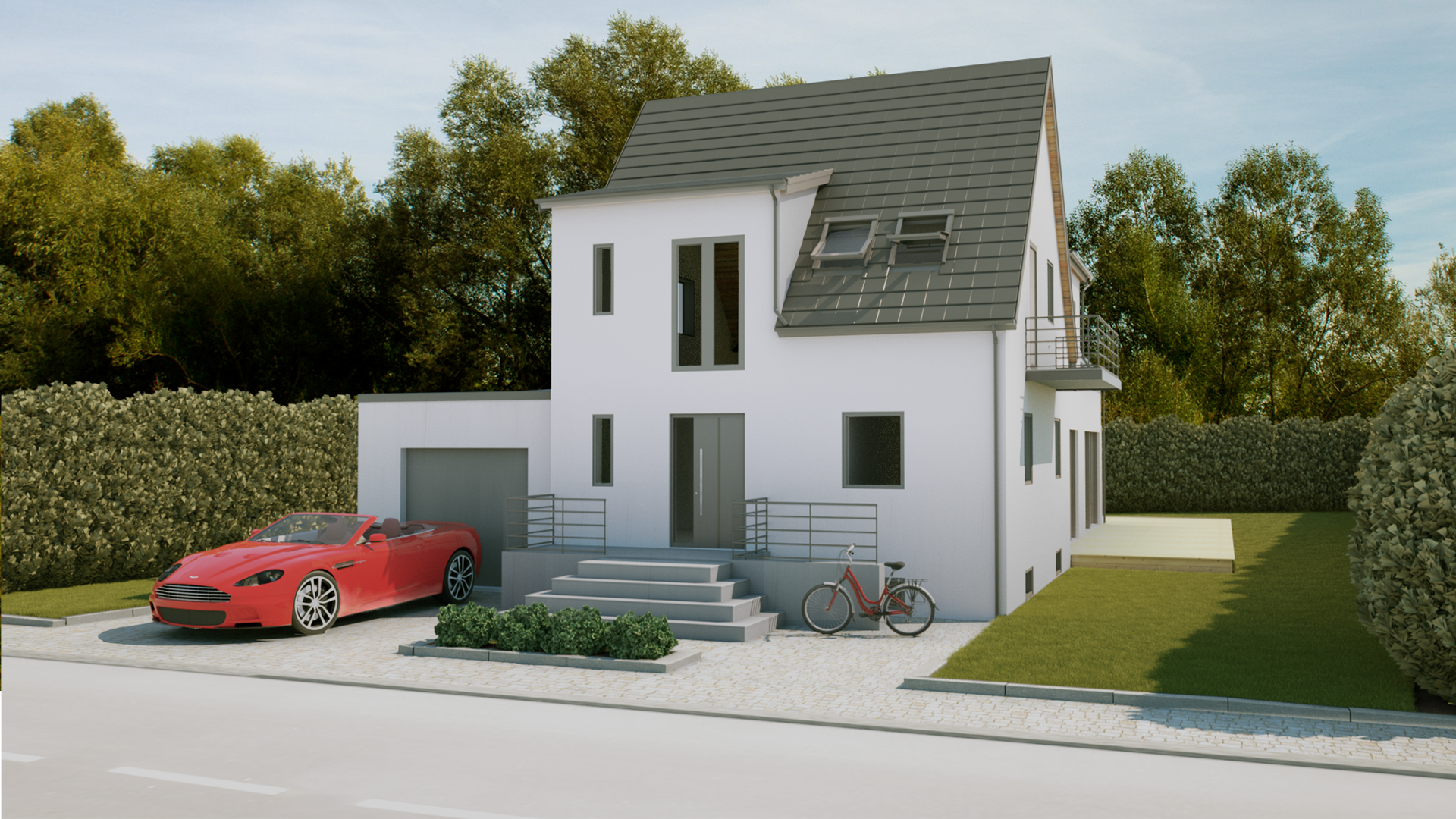 I would like to suggest to try camera on eye level (i.e. 1.65m) and show more sky above the building to get more natural camera feeling and better layout. Show more of the side of the house might improve the image too.