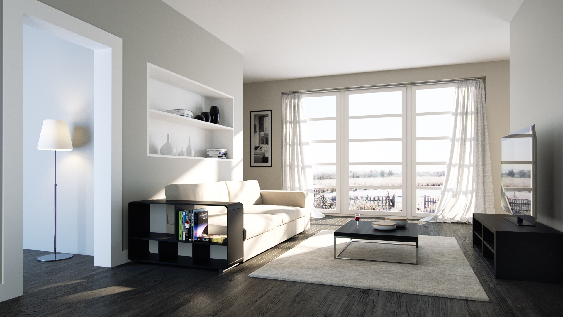 For example the curtain material is wrong. There is no transparency. In reality we should add an opacity mask or mix a diffuse shader + specular with roughness set to 0,1 and index set to 1.