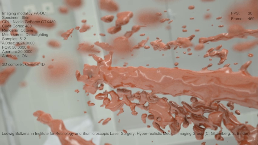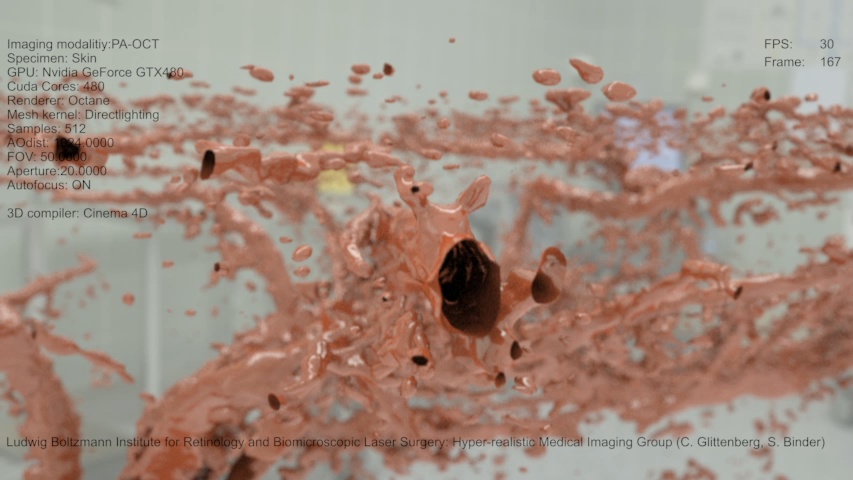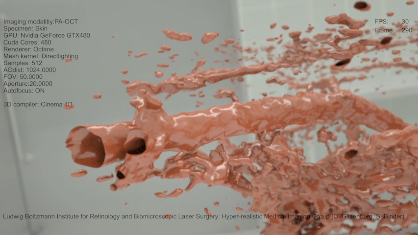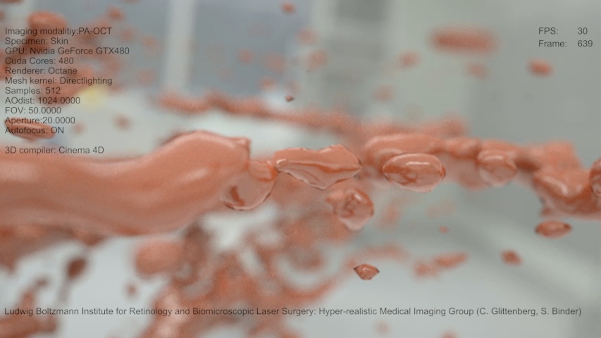 This is an example of an optical coherence tomography photo acoustic data set of the blood vessels in mouse skin. Visualized using automatic iso-mesh segmentation and GPU-Physically based rendering. Keep in mind the patient was alive when this was done. The process was automatic. There was no mesh modeling required. This was rendered entirely on a GPU (Nvidea GTX 480) using CUDA technology using Cinema 4D and the Octane Render Plugin.