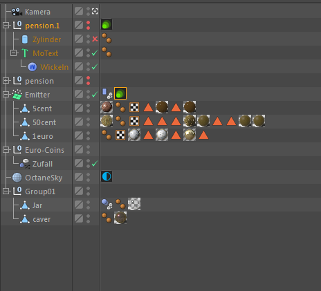 I have a cached emitter with an octane object tag. renders fine in LV, somehow stops the emission in the final render (and shows some dots instead of coins).