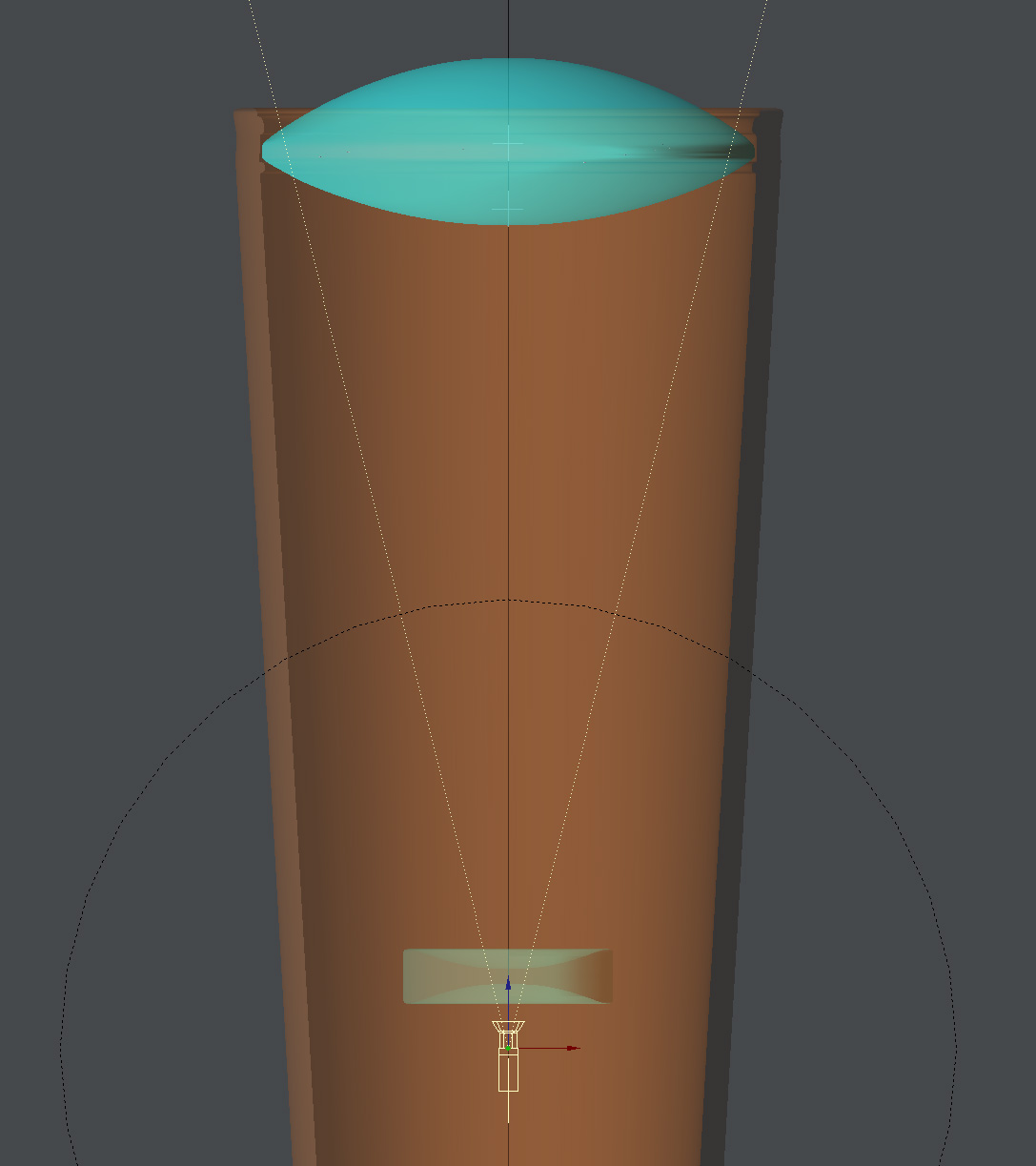 It took a bit of tweaking to find a lens combo that would allow the DoF to focus through to the projected plate, but I settled on a concave lens right in front of the camera, and a convex lens in front of that. (See below. Dotted ring indicates camera focus distance.)