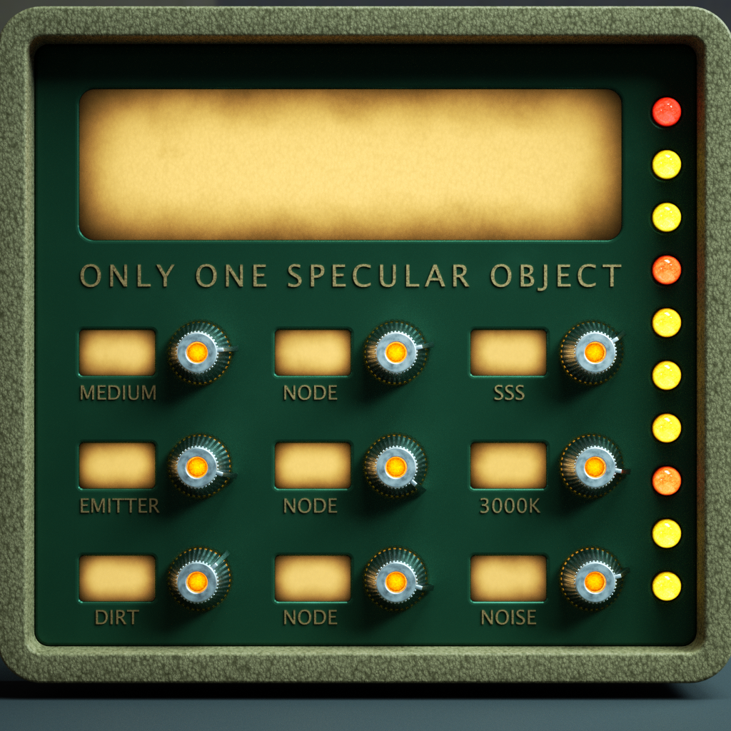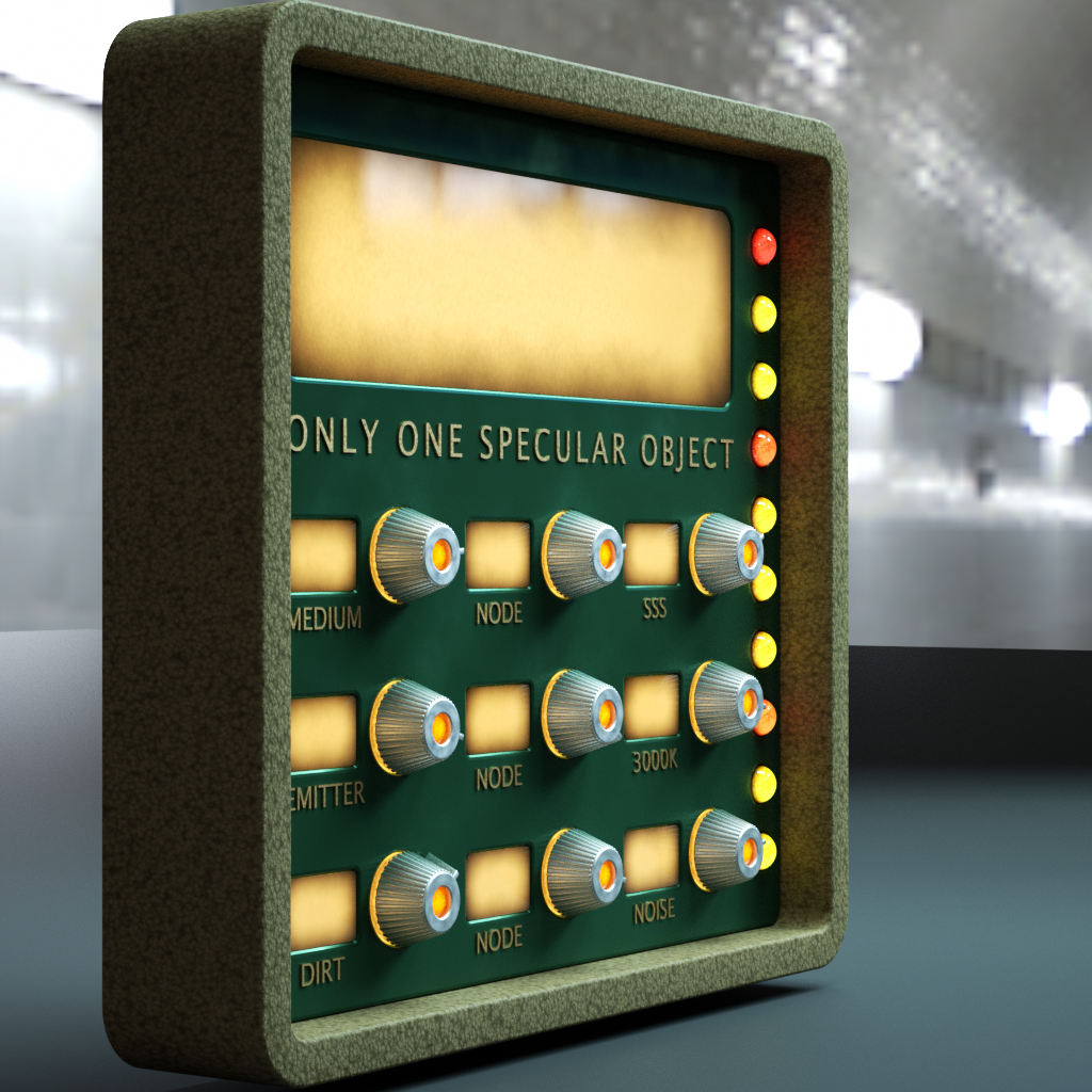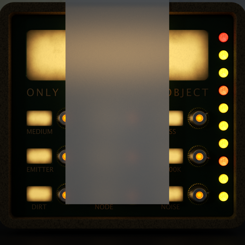 Image 2 shows the displays with another much brighter emitter that I put on top of the initial emitter and which is set to be invisible for the camera. This second emitter is very bright and therefore casts the desired illumination to other objects like buttons, case, floor, fader.