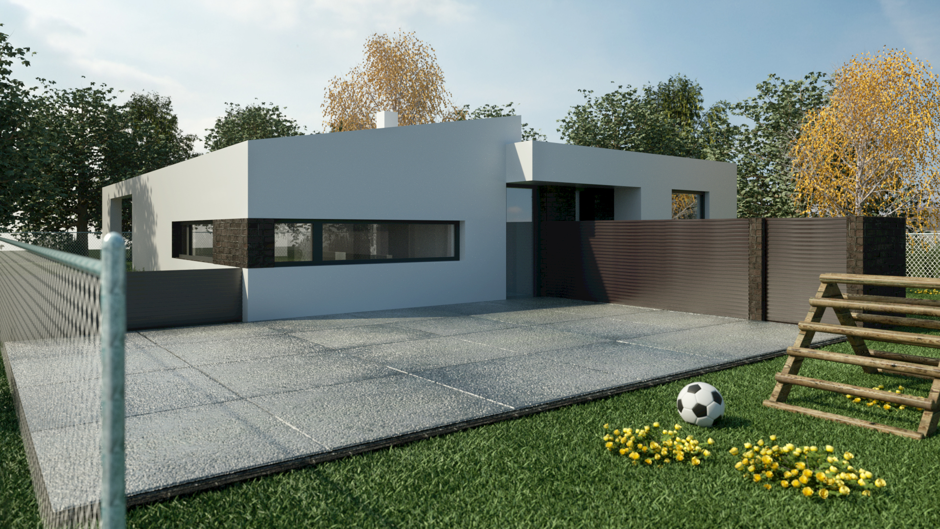 3. In the reference picture, the bicycle is important, the house immediately feels occupied by "real people". Adding a few objects like maybe a car, a ball, flower pots, an outside lamp, curtains an Athena for TV would help.