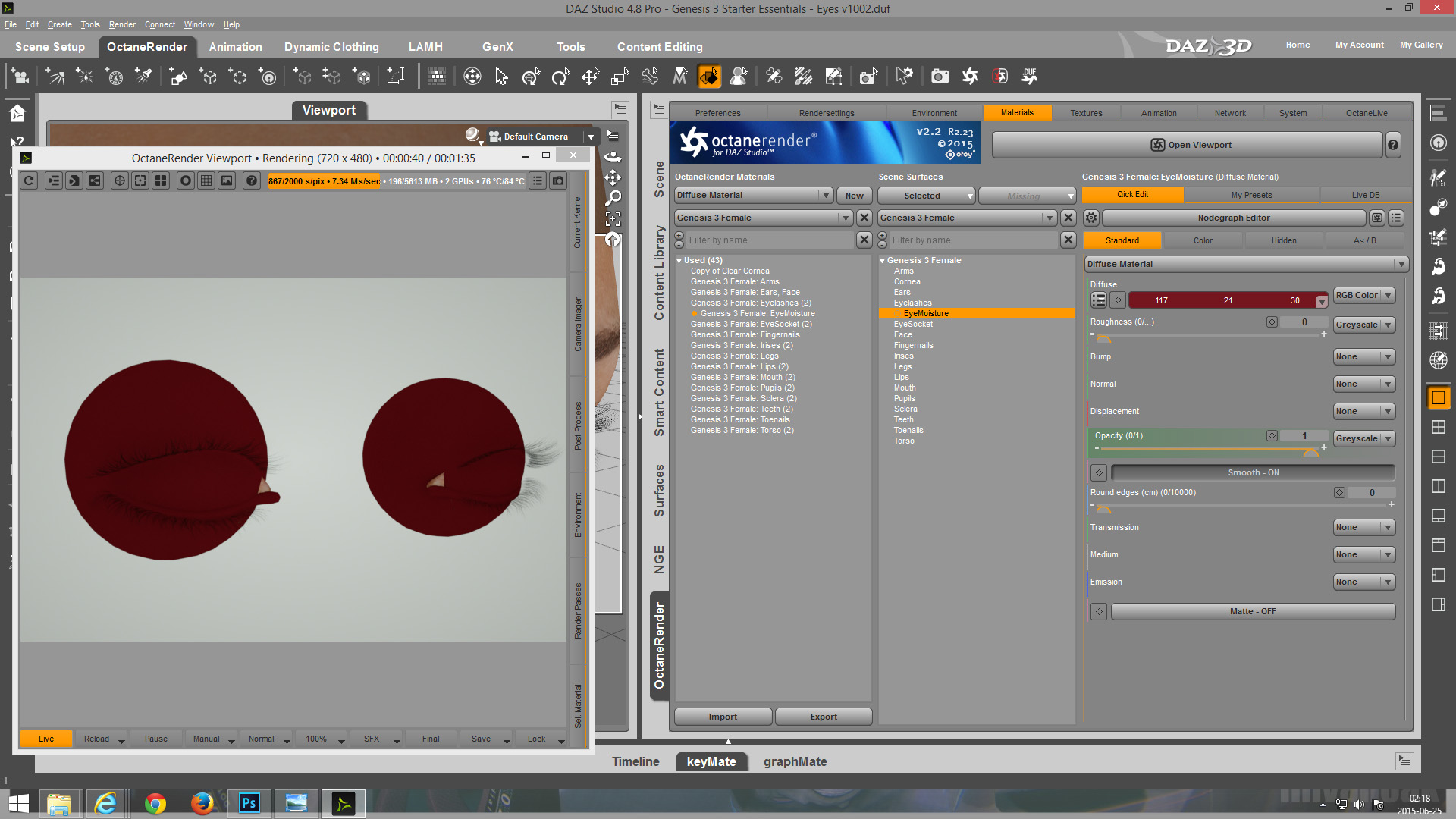 - The EyeMoisture surface will load at full opacity. Set it to zero to make the underlying eye materials visible.