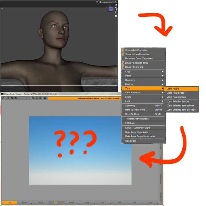 I'm using OCDS build 2.23, has this happened to any of you? Hitting "Zero Figure" makes a figure disappear from OCDS viewport. Same thing with "Zero Selected Item(s)", it causes the selected item(s) to disappear from OCDS viewport. I've prepared two screenshots using V6 to show what I mean. - tested with G1, G2F, G3 and Cybermech 4, they all exhibit the same problems.