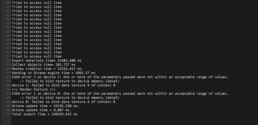 where did this occured? In LV or PV? I see 22sec process time for materials, 12 sec. for mesh creation, 35 sec. for update. total 145 sec. Your scene should have huge amount of textures and objects. I don't have a exact idea what exceed limits but if you have out of core also have free vram, you should exceed triangle limits. But it points a texture error in Cuda error. I couldn't help so much for this. That's completely out of plugin and occurs in Cuda Renderer. You can try to delete/disable some parts of scene to understand what causes this.