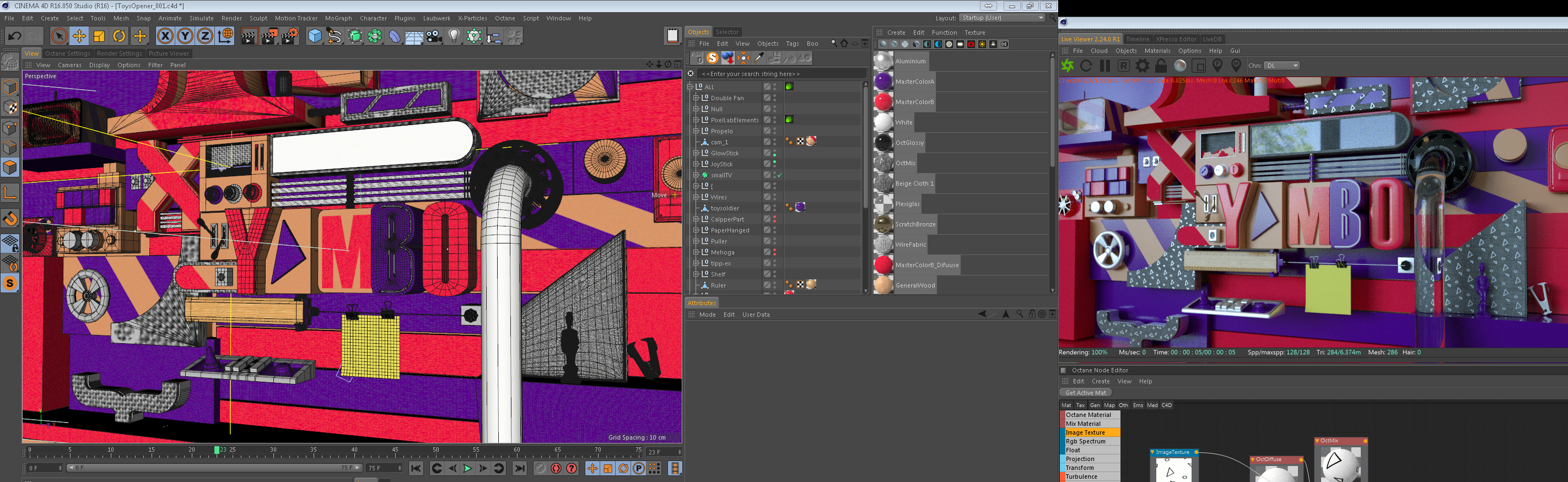 The scene is not that heavy, only pretty high object count (Half million polygon total, and 350 different c4d objects, most of them are low poly models as you can see in the screenshot attached)