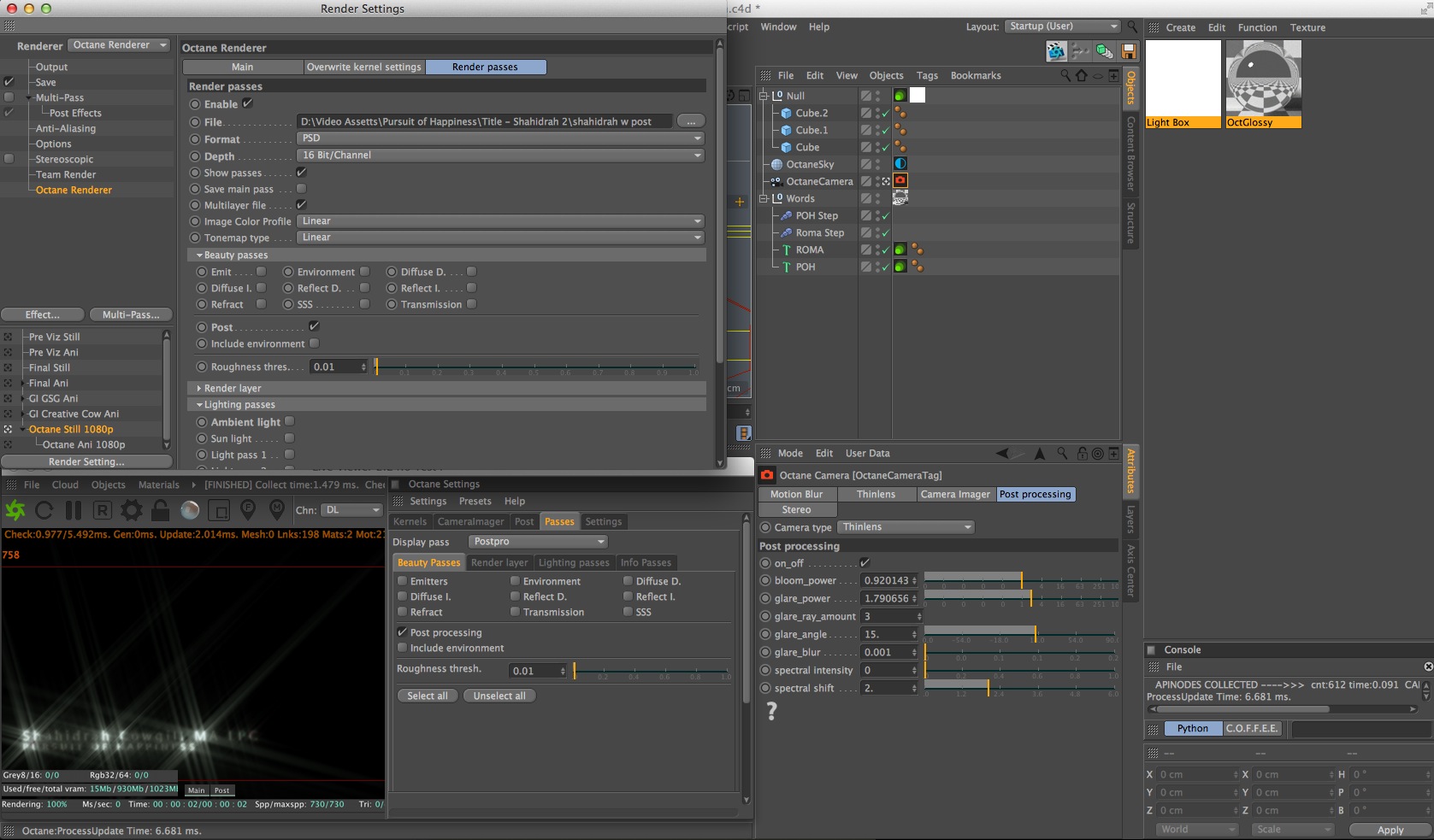 Well. I thought it worked great. But question. Do the post effects output not come with an alpha channel? I was wanting to overly this text over some footage with the light glare. Is there a way to get an alpha channel with the post light glare out of Octane?