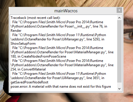 File "C:\Program Files\Smith Micro\Poser Pro 2014\Runtime\Python\addons\OctaneRender for Poser\MaterialManager.py", line 254, in ConvertMaterial