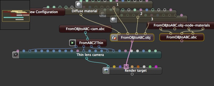 here is a Lua script for helping in the substitution of an obj static mesh with an alembic scene file: The script connect the materials only if the names of the alembic pins is identical.