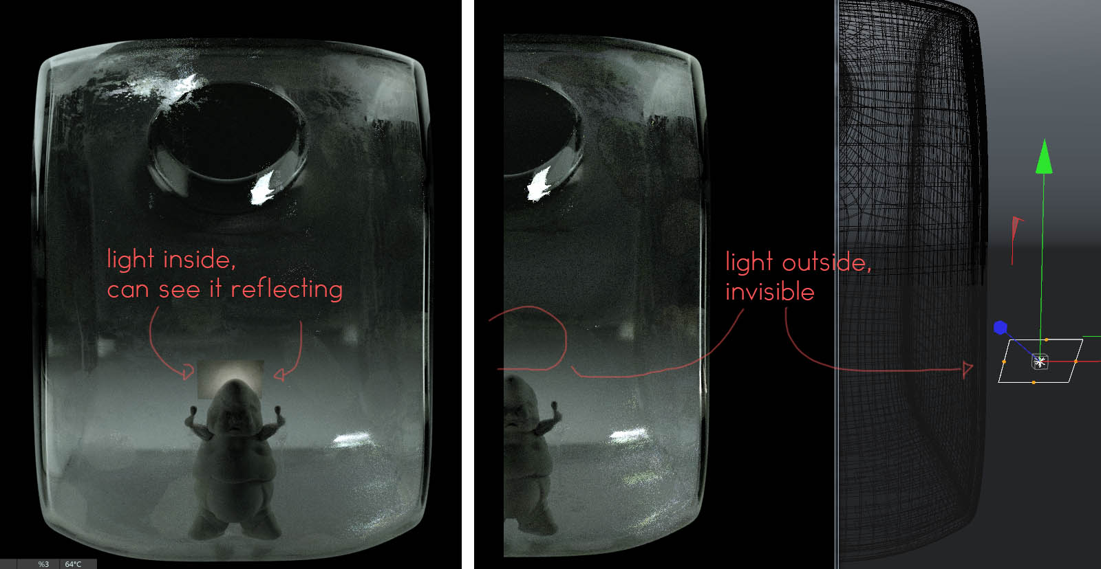 However, when I put a light source inside the actual jar/fishbowl, it shows up in the render - even with the Camera Visibilty turned off, and with high Specular Depth values in the Pathtracing Kernel.