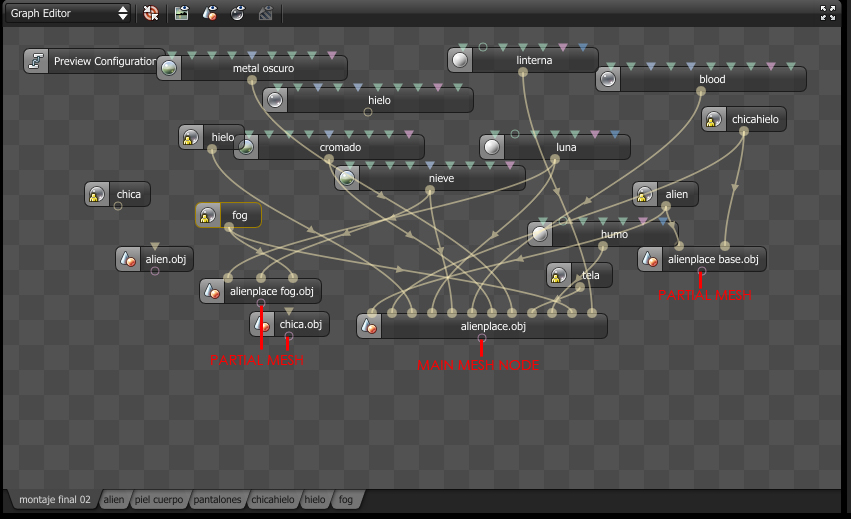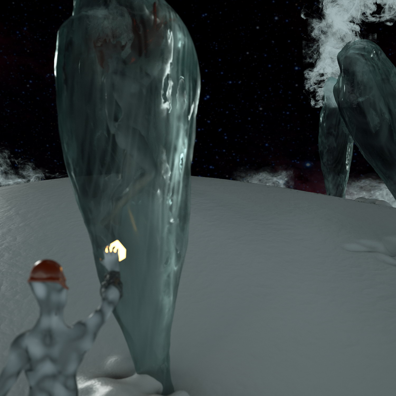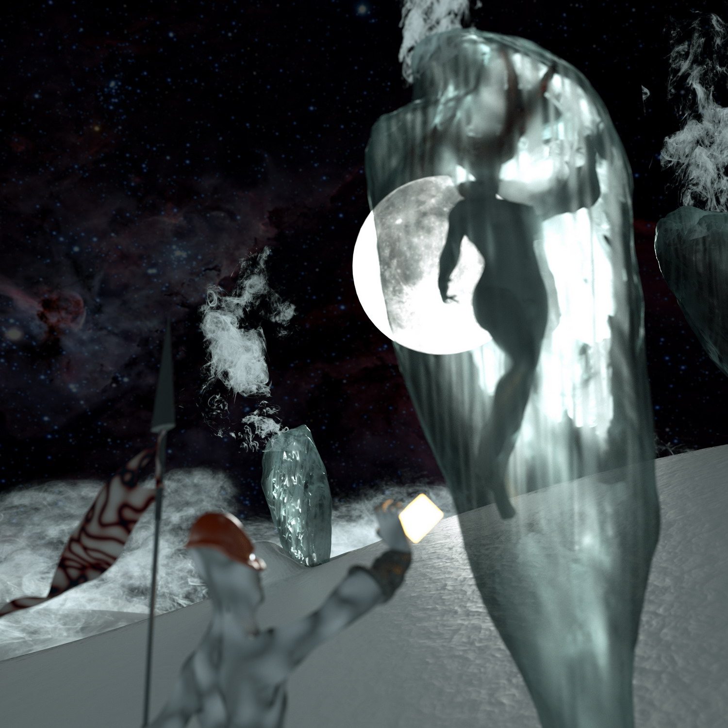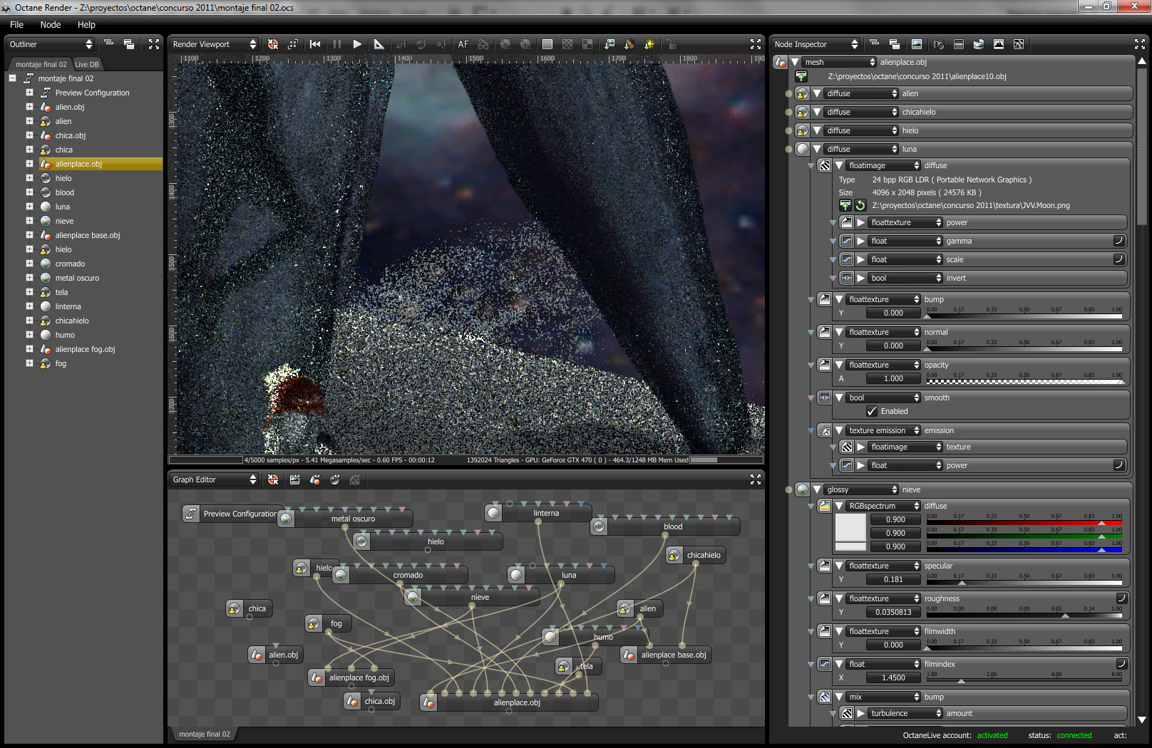 Well, for this year's competition I wanted to do something different from my usual archviz stuff. I've always liked sci-fi, and it came to my mind some classic 50's literature, I threw some sketches. I knew I wanted to test the new features of octane, as light passing thru materials using opacity. I thought, hey, how about if the whole scene is light by a moon, I mean an actual moon emitting light (well not actually physical correct, but almost). So I found a neat moon map I used as texture emmitter http://celestiamotherlode.net/catalog/s ... ator_id=10. Then I used Sculptris to model the whole scene and hand paint the masks for the materials. After riggin the alien and the girl in max I exported the whole thing to octane and the fun begun. Finally I've made used of macros and being able to pan around the node graph I've had tons of fun playing with the materials. Besides the steam maps (modified from some smoke images from http://cgtextures.com), the moon and the characters material mask the rest is done with procedural textures. Probably the one I've enjoyed and like more is the ice one.