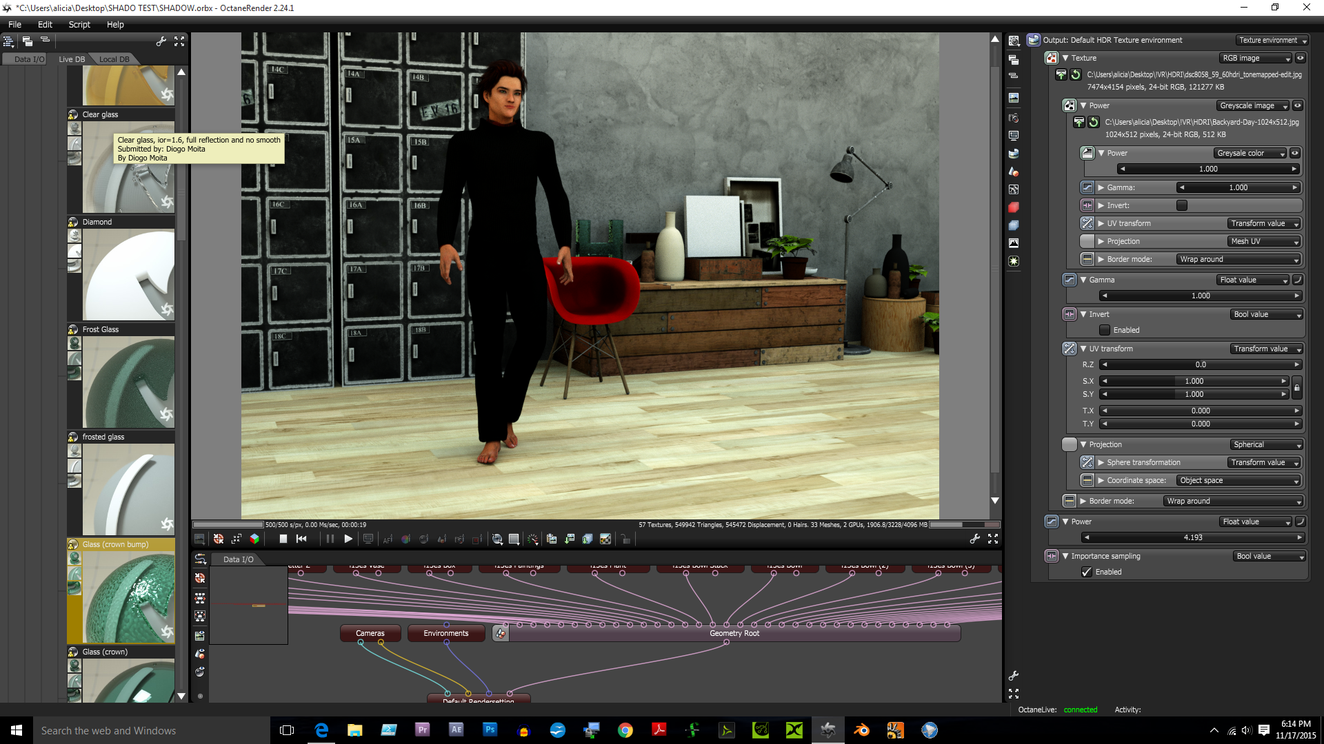 I find most texture environments have this issue -- I have resorted to trying to use emissive lights, but not all scenes make sense with that kind of lighting and it can be hard to maneuver and use them to get the shadows just so...this picture a case in point--I want hard shadows beneath her feet and a bit behind her so she looks more in the scene -- Octane's default natural lighting is very white--when I add textures HDR's the scenes just look dark and I don't find much shadow to use...bepeg4d wrote:Hi,