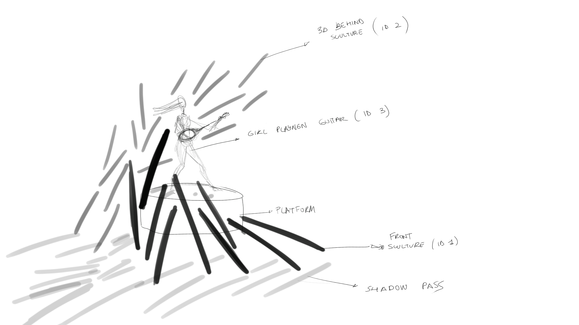 For my render I need 3 ID passes, the pieces of the sculture in front of the girl (ID 1) , the pieces of the sculture behind the girl (ID 2), the girl (ID3) so I can remove her in post.