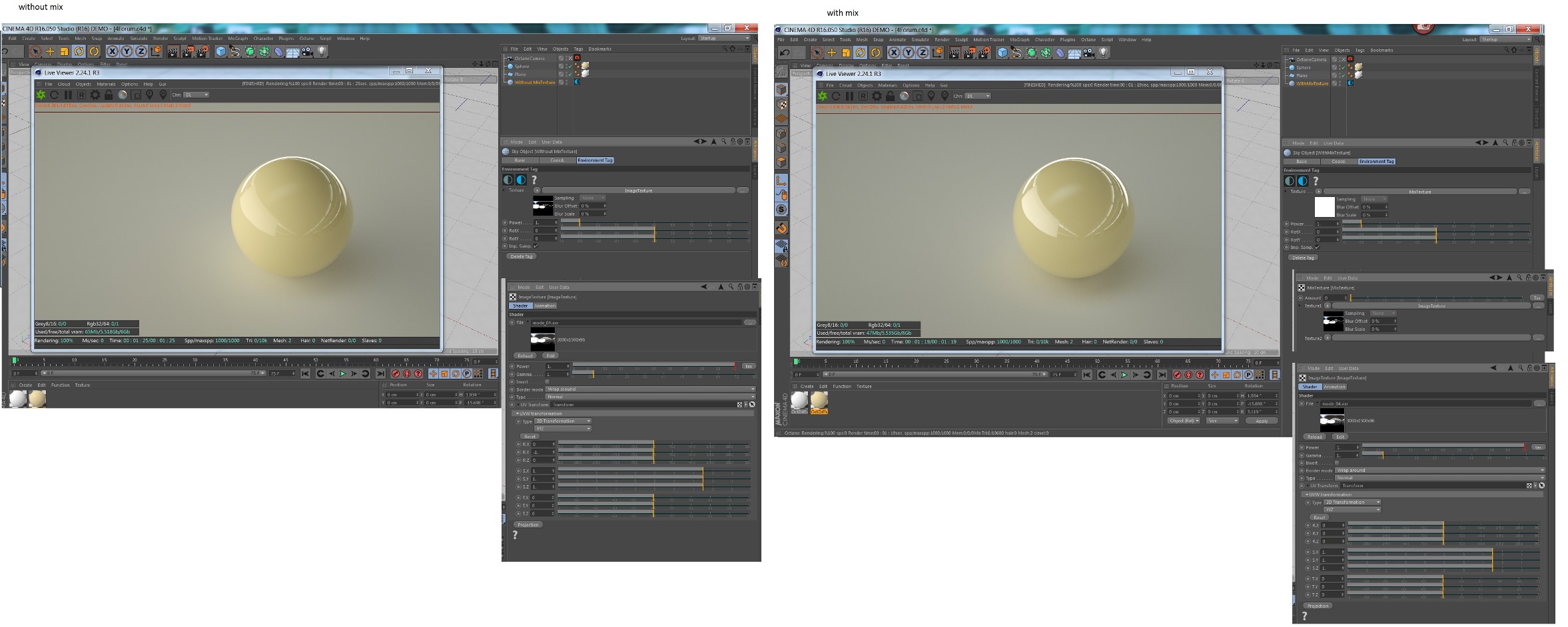 I need to do a transition between 2 HDRI's and i cant get an accurate result. (it's not a rotation issue, I know plugin internally creates a transform when you have just an image texture so transform node with the right transformation is applied). Everytime i'm trying to put the HDRI inside MIX Texture something is messed out. Seems like a gamma issue, but any gamma change (0.4545) not solving that. I just can't reach the same looks with the HDRI inside a MIX Texture.