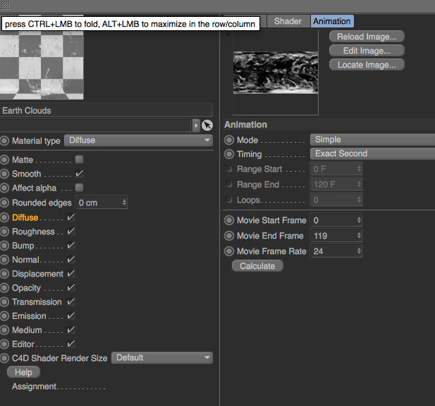 "Calculate" is a button that needs to be clicked for Cinema 4D to recognize that the texture I loaded in is an animated sequence and not a static still image.