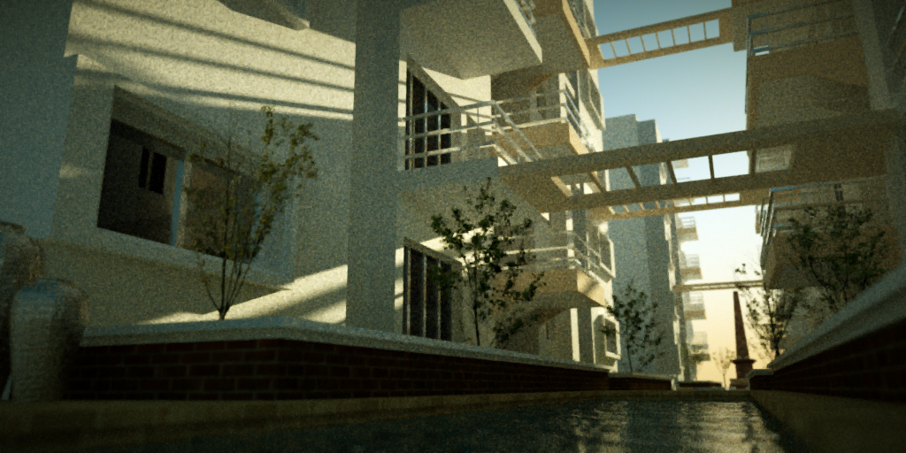 its a simple scene, a midrise apartment with central pedestrian street- with a small area as reflective pool, and low-height boundaries. its interconnected at upper levels with pergolas to give a more 'enclosed' feel...