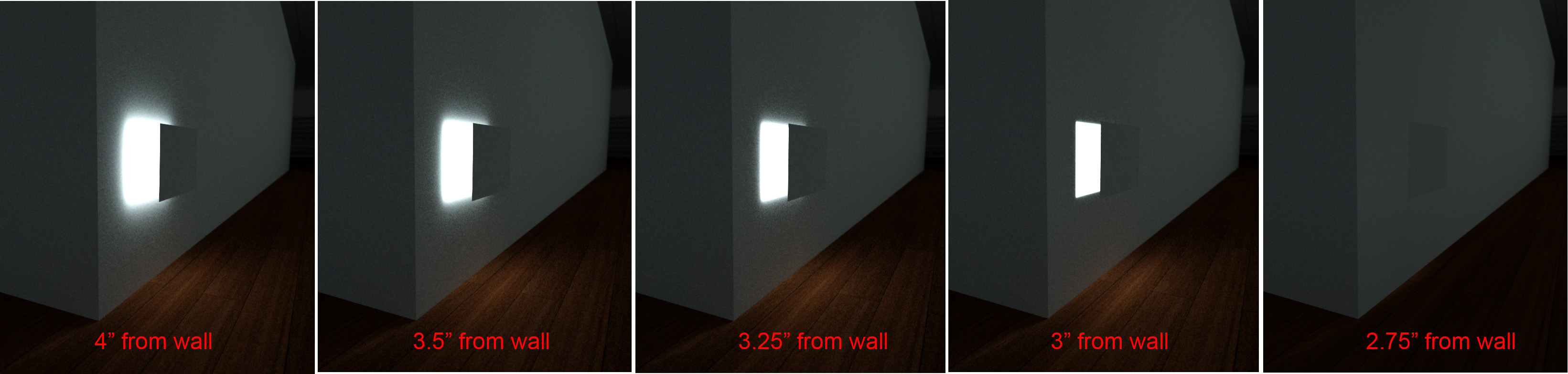 Also notice that the floor seems to be getting the same amount of light regardless the wall-to-panel distance except when the light on the wall turns of completely at 2.75" the light on the floor also turns off completely.