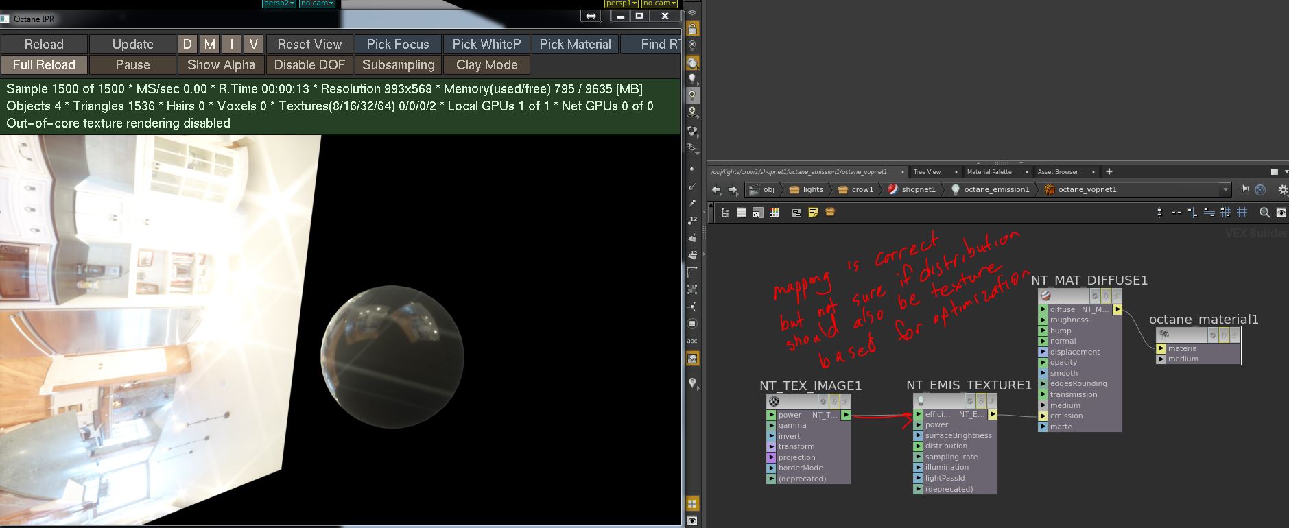 I'm trying to map textures to grids with uv mapping as light sources and it would seem that if I use the Object Properties to set emission, then the texture mapping looks incorrect sort of like a pinched polar cap. If I use an emission material where the texture is connected into the distribution port, it ignores uvs and looks like it's sampling as an environment sphere. Only when connecting the texture to the efficiency port does the mapping look correct. Is that how it's supposed to be? does the distribution not use the texture as an optimization for sampling the light source?