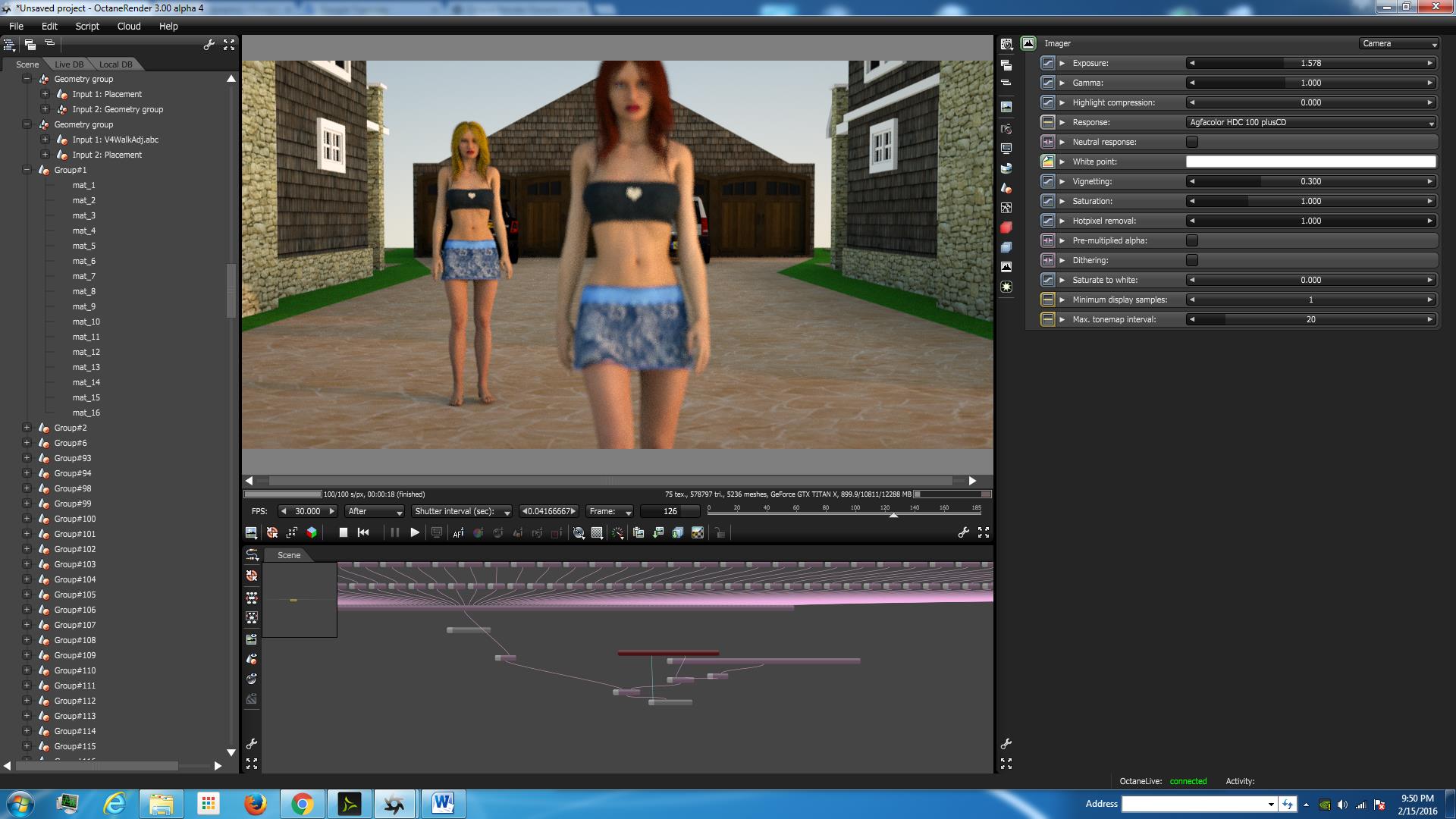 It defaults to what you set in Daz, and you cannot tweak the numeric camera parameters for focus, and the camera target cannot be changed unless you detach the abc cam node connector from the render target. However, it actually lets you select any geometry as a focus point beyond what it was imported to focus on , so for example I could select the girl in front, middle, or garage in back, and it would render out the scene with that focus continuously as the frames progress. Although, I had no focus change as part of the Alembic export itself from Daz. Had this been the case, I don't know what the result is yet. Nevertheless, cool!My guess is that the ABC exporter from the DAZStudio plugin is only exporting camera position, target and up, and potentially not fov (but I might be wrong - try it for yourself). So you can zoom by moving the camera position in DAZStudio and that should get exported in the ABC file.