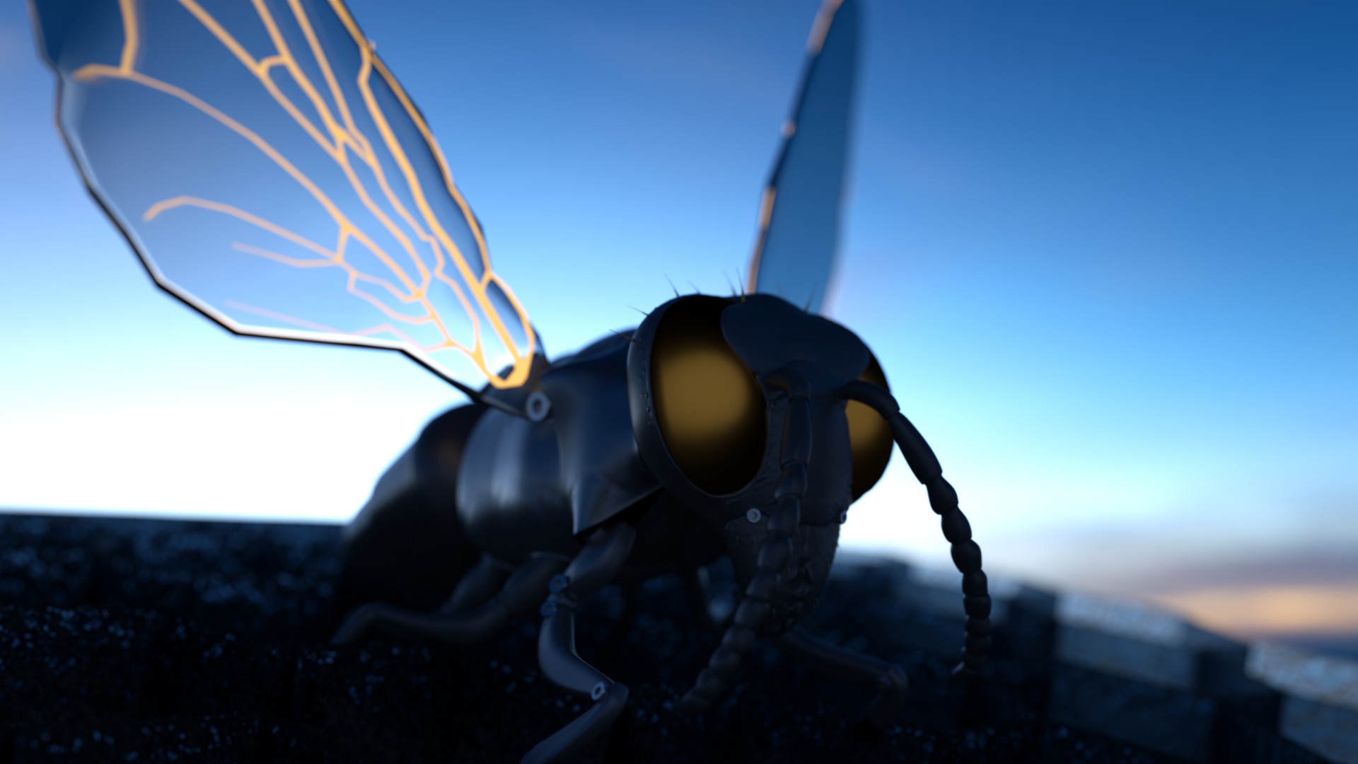 Yes, I have a lot of work yet, but the idea is a night scene with small mesh emitters all over the wasp.