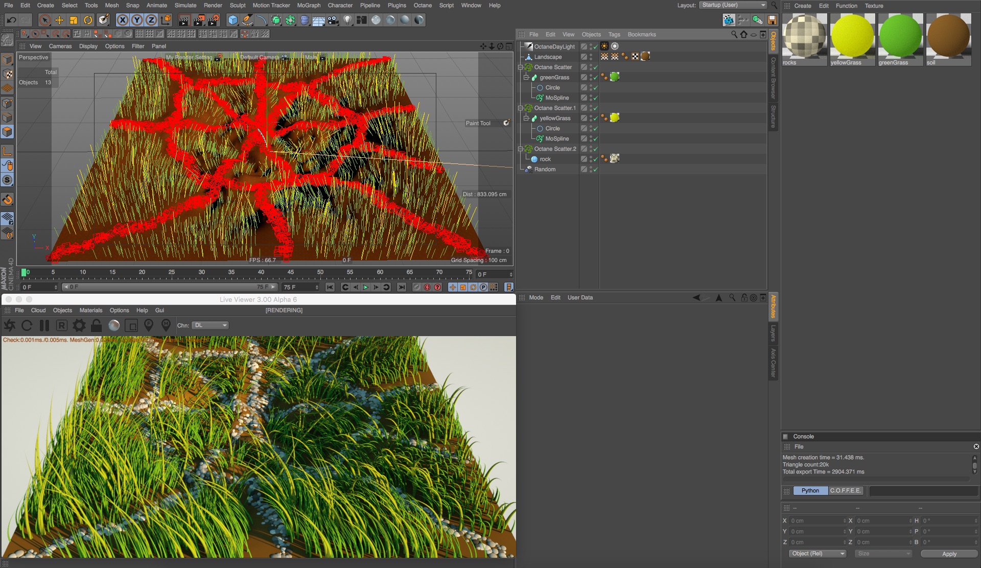 this is my first posting here. I made my first serious exterior scene with octane now with Instances. Grass f.e. is completely made out of instances with just two meshes for variation. A cloner with random is then applied to them so it distributes all across the surface.