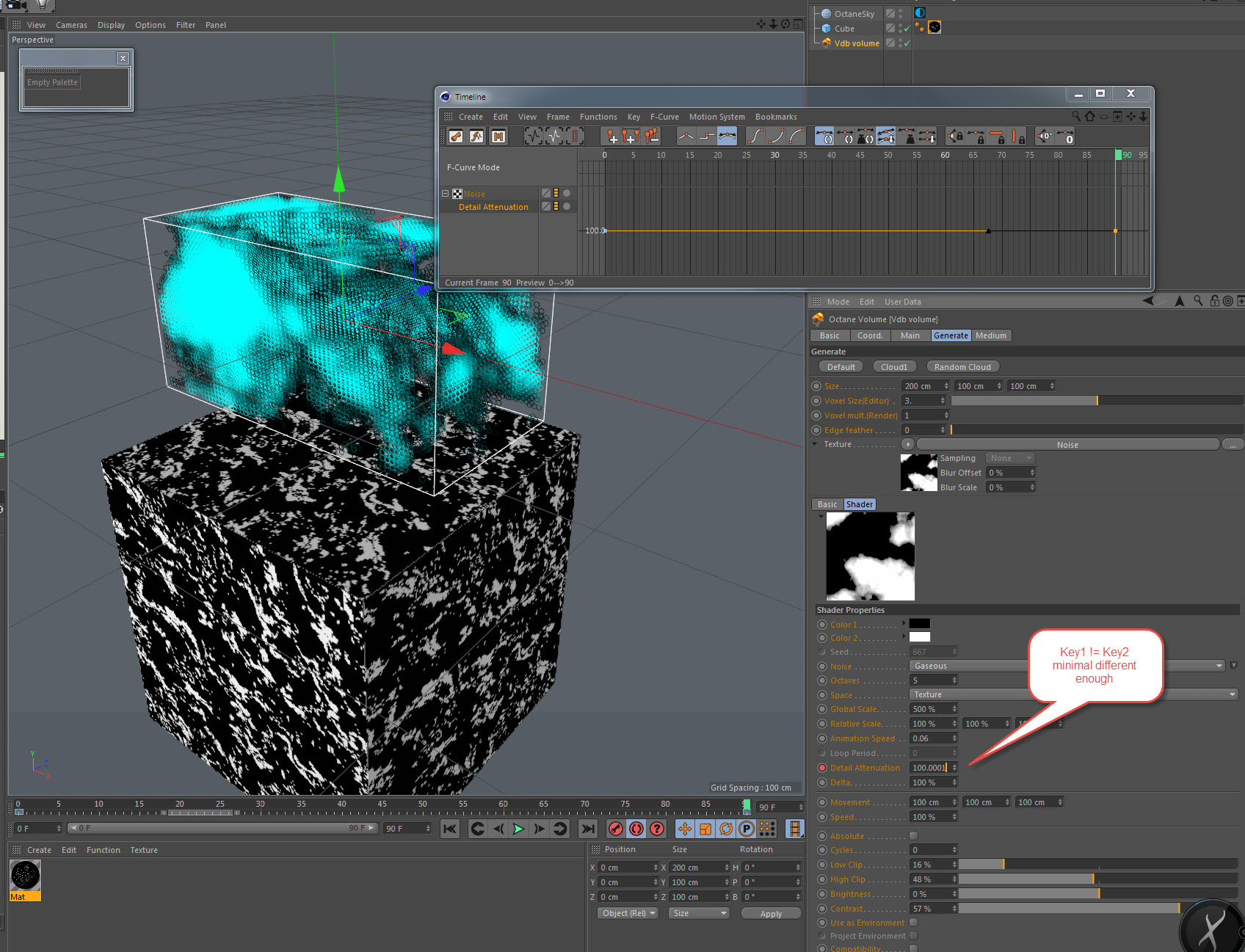 Adding the keyframe to the Movement parameter means Octane can see that the noise is updating and refreshes it every frame.
