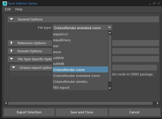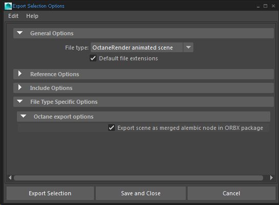 file>export all> octanerender alembic (default file extentions checked and preserve references - although, i have tried different checks/unchecks here with no change in results)