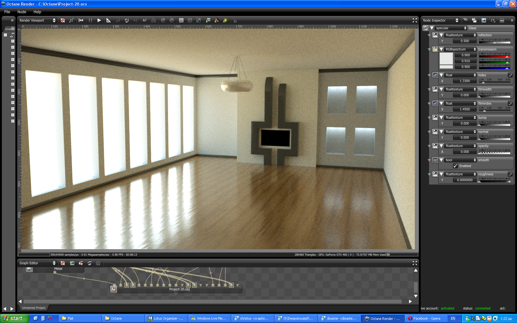 Analysis : The only way to have these bright rays in the room is a) To have alphashadows TICKED and to NOT have glass opacity set to 1 but have it something like from 0 to 0.6. Isn't this "wrong" I mean in real life wouldn't these ray pass through the glass (I USED IOR = 1.5) and hit the floor?