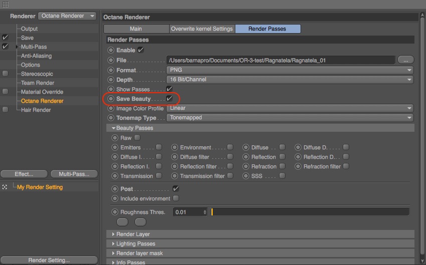 Now in Octane 3, checking the post render pass saves the post fx out, but also leaves it baked into the beauty pass as well, so I can't manipulate them separately in compositing.