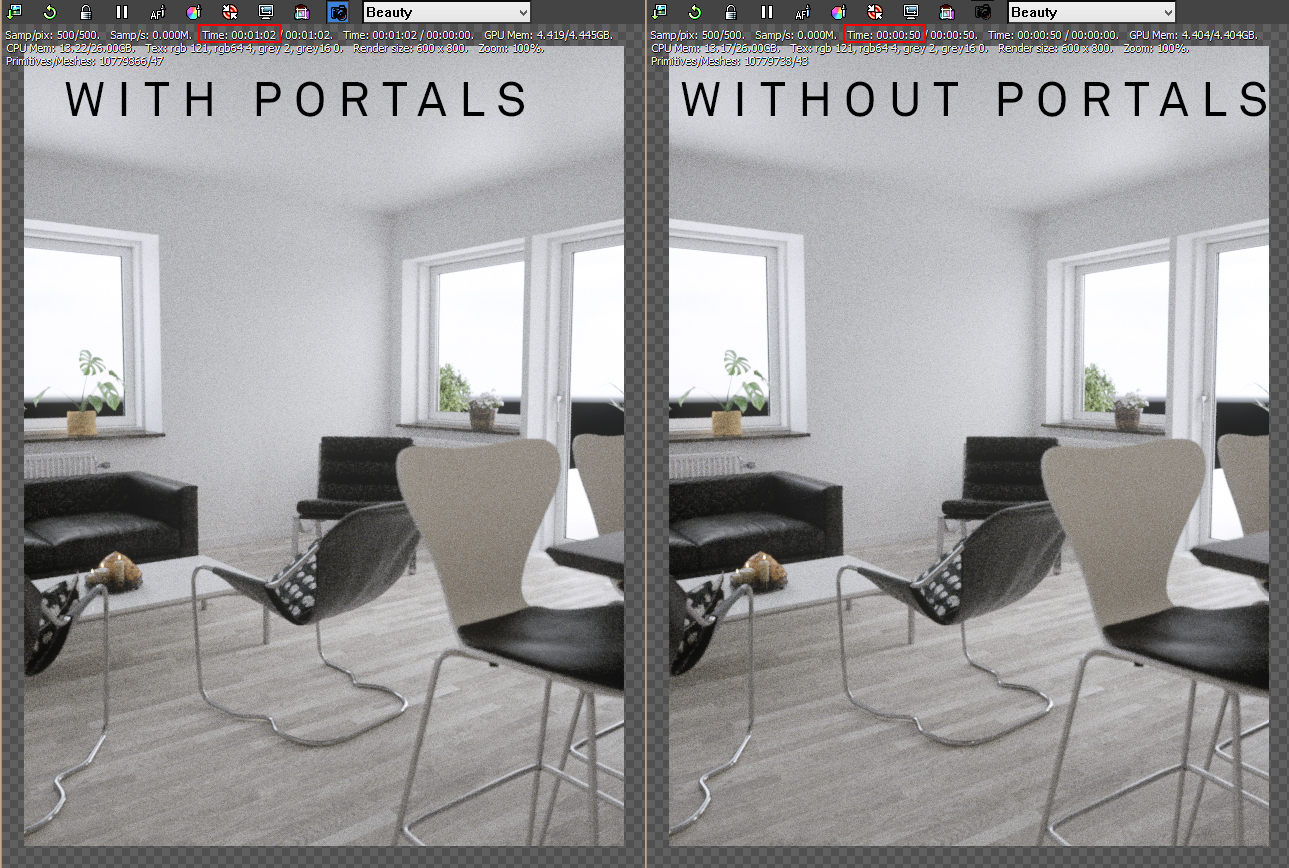 I'm trying to keep render times down for interiors with corners of rooms that are far from the windows, in other word a pain to get noise free. Thought portals could help me out, only to realize that portals actually makes things worse.