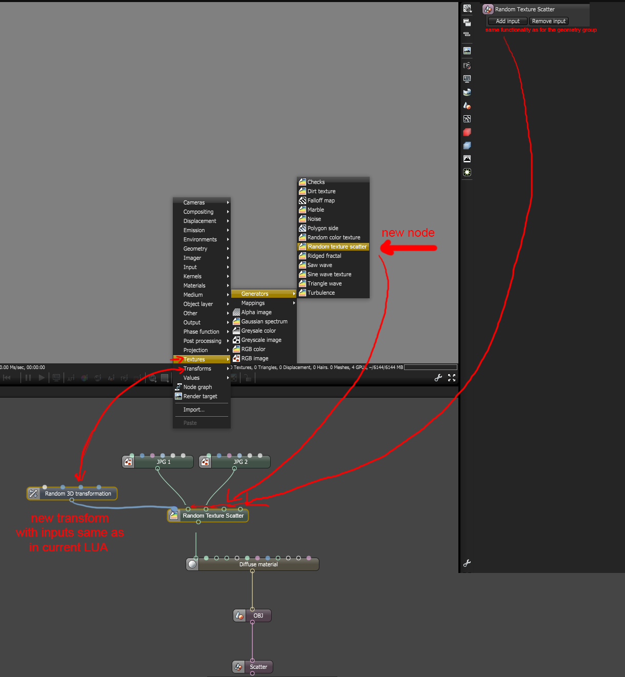 Random texture node that would work in real time is so needed. Namely it could work like this: when you connect it to the texture input it would come with a single input for a texture but with the option to increase number of inputs - exactly the same way that the geometry group works. And another random 3d transform having all parameters from LUA would be great. The schematic is attached.