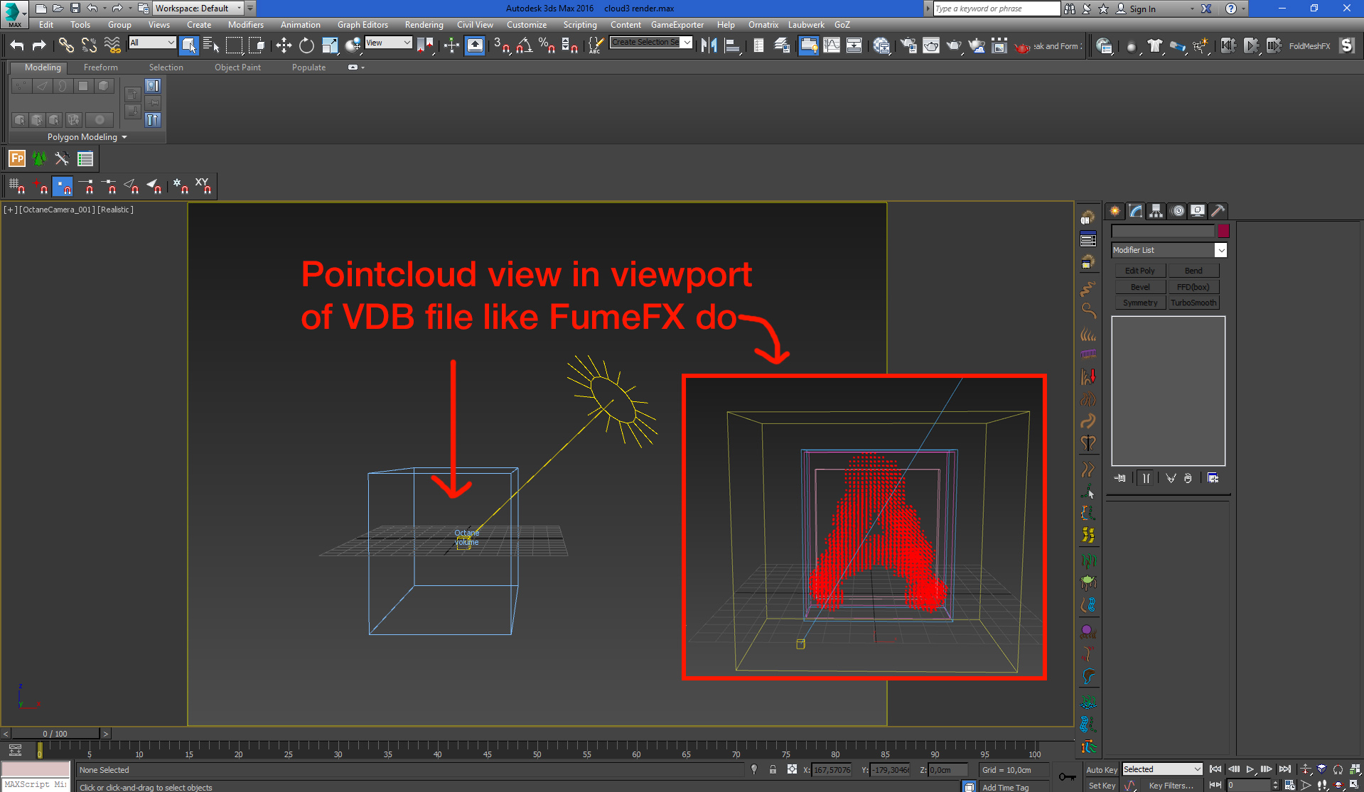 Is is possible to make some "point cloud" preview in viewport of Octane volume (VDB files) like in FumeFX for example. Now it is difficult to work, when you dont see where volume is.
