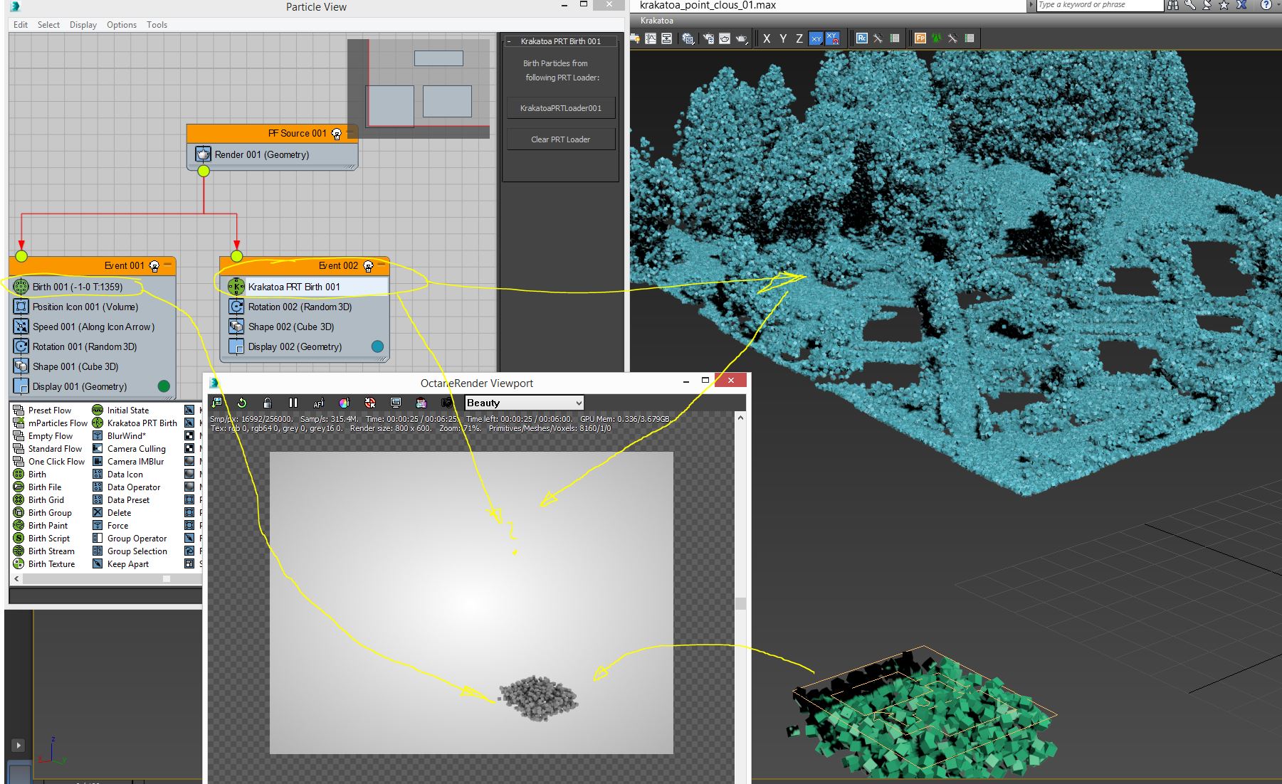 tried to render a point cloud via krakatoa prt loader with no success. native particle birth seems to work.